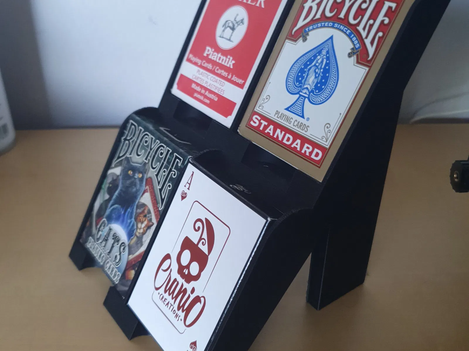 Một phiên bản của giá đỡ bộ bài của tôi, có thể xếp chồng theo cả hai chiều (trong OpenSCAD, không phải trong đời thực).