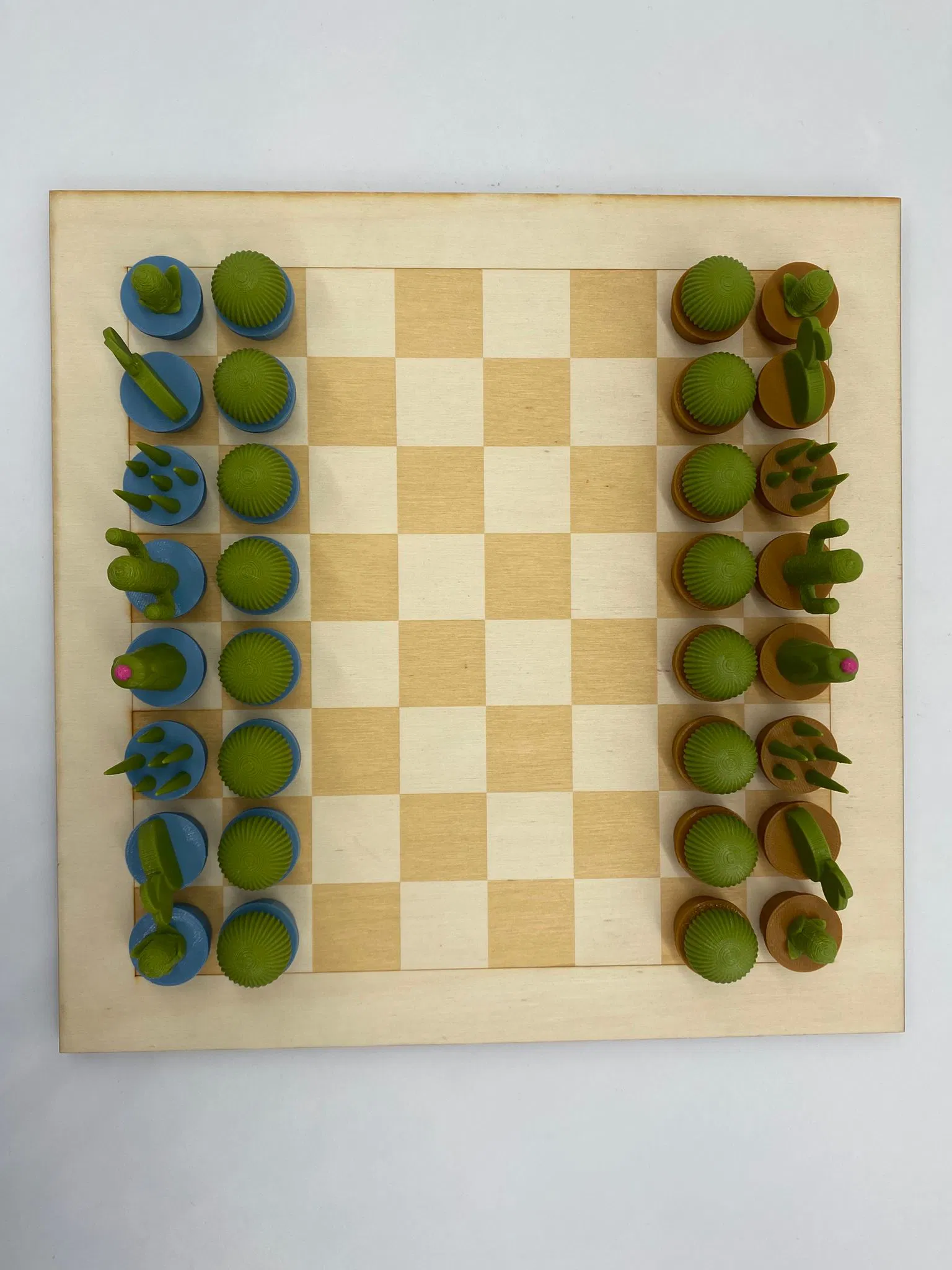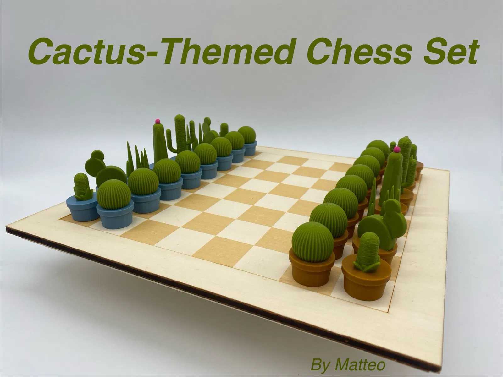 Bộ cờ vua lấy cảm hứng từ những loài xương rồng đầy sáng tạo. Mỗi quân cờ được thiết kế tỉ mỉ, vừa mang tính thẩm mỹ cao để trang trí, vừa đảm bảo chức năng chơi như một bộ cờ tiêu chuẩn.