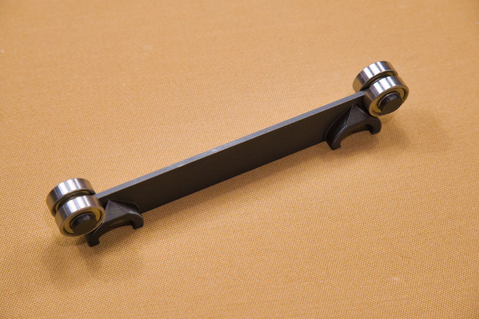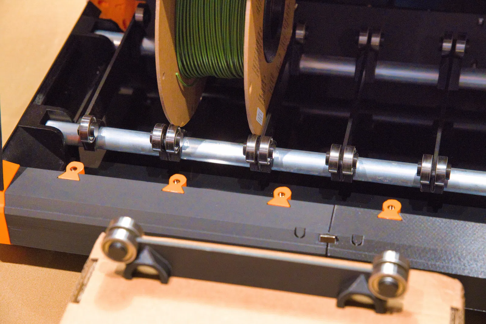 V2: Cuộn filament đặt lên các trụ in 3D lăn trên vòng bi. Ví dụ về V2 có ở hình cuối cùng.