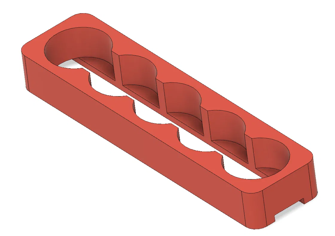 Gá hàn pin 18650 loại 5 khe giúp căn chỉnh cell pin chính xác khi hàn điểm. Thiết kế hỗ trợ kẽm hàn 8mm/10mm, dễ dàng tháo lắp và tái sử dụng cho các dự án DIY pin của bạn. In không cần support.