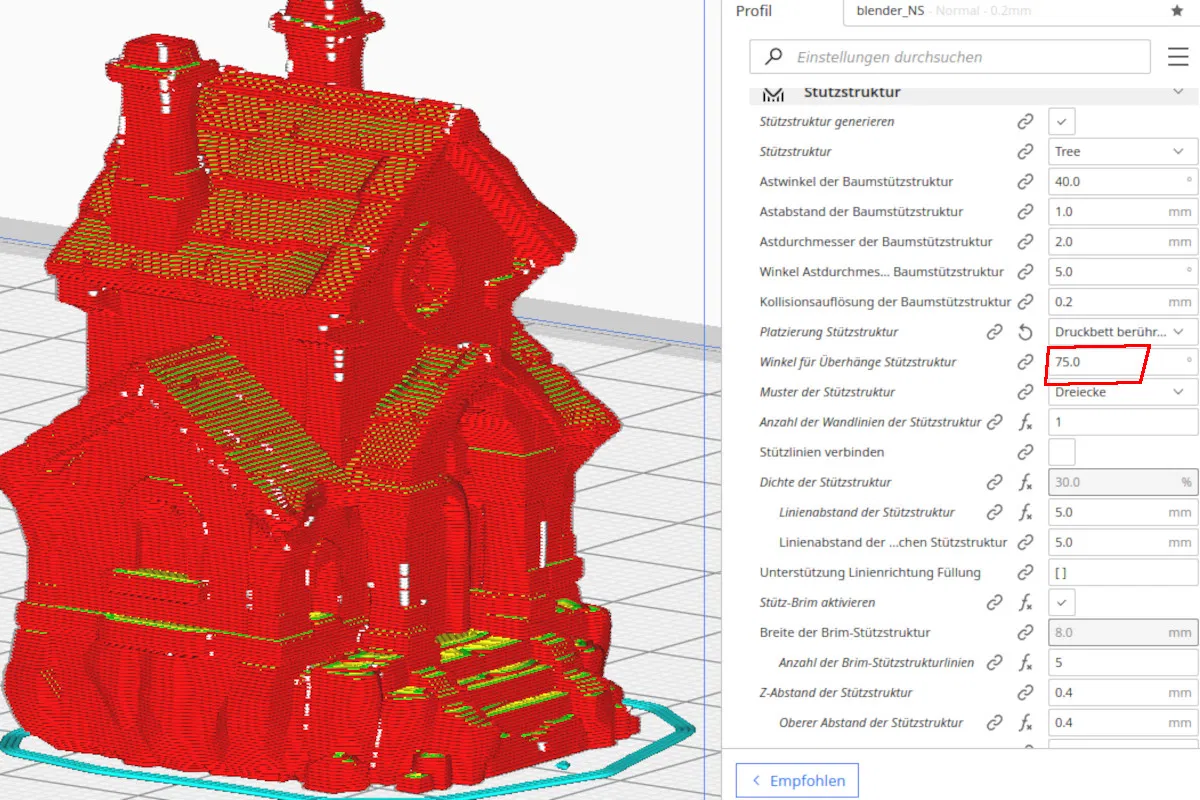 Trong phần cài đặt Experimental của Cura, hãy bật mục Overhang, chỉnh góc tối đa (max deg) là 74 và góc bắt đầu (overhang start) cũng là 74.