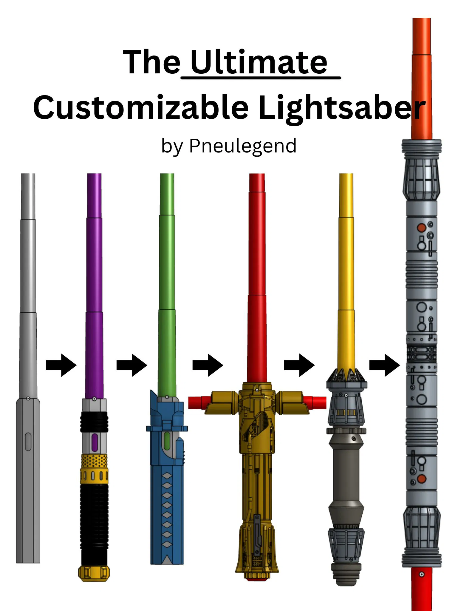 Hầu hết các chuôi kiếm (hilt) lightsaber khi in thường phải để đứng, điều này dễ làm cho sản phẩm bị yếu và dễ gãy dọc theo đường in (layer lines). Với thiết kế nhiều mảnh của mình, tôi đã khắc phục được điểm yếu này đồng thời cho phép bạn tùy biến thoải mái. Chán ngấy việc giữ mãi một kiểu lightsaber đơn điệu rồi phải không? Chỉ cần in thêm vài linh kiện là bạn có thể hô biến lightsaber của mình thành một phiên bản mới cực chất. Bạn luôn có thể thay đổi qua lại giữa các kiểu đấy!!