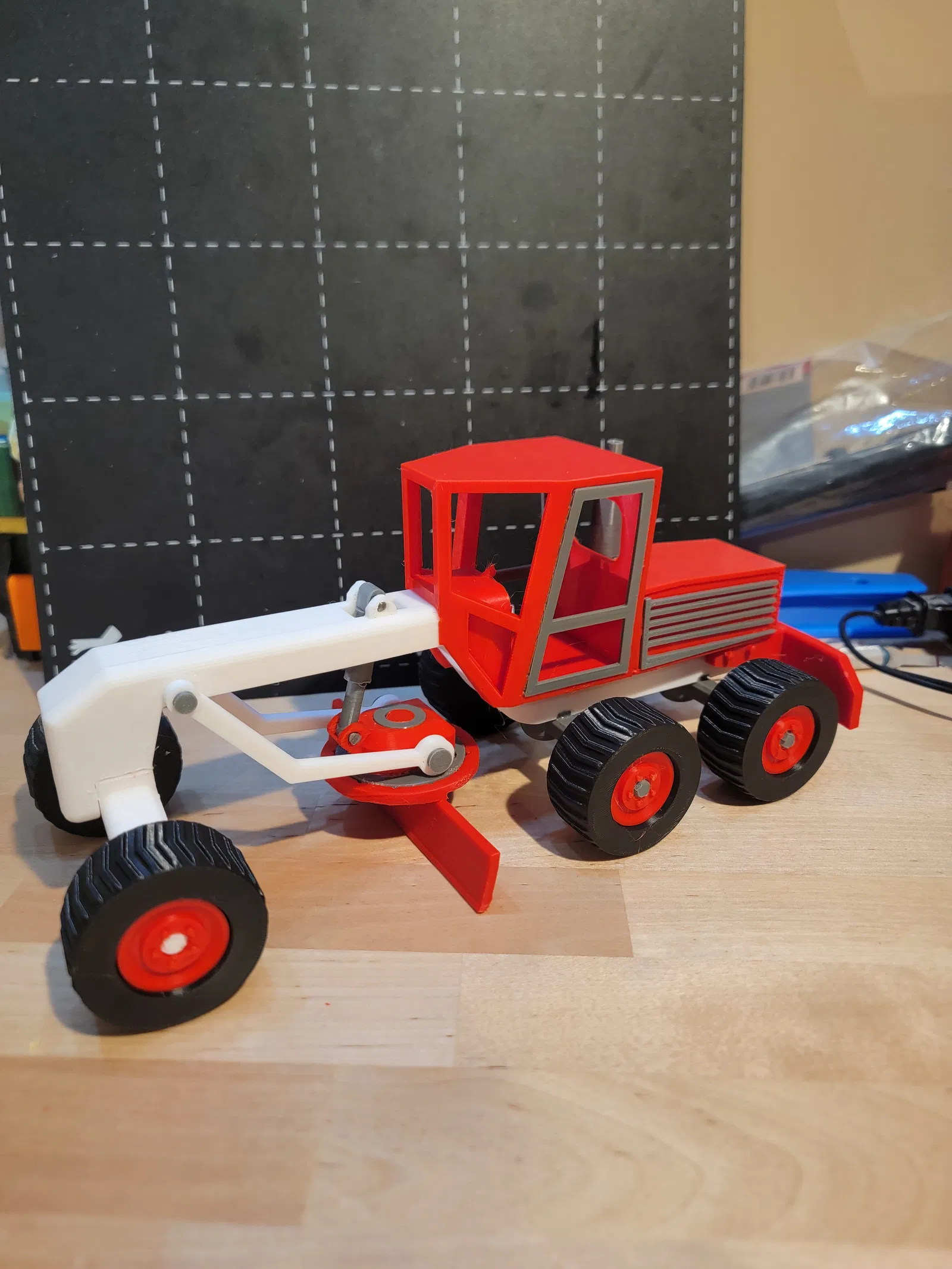 Đây là mẫu xe ủi đất (grader) do mình tự thiết kế. Các bộ phận có thể cử động được, tuy nhiên mình vẫn đang tìm cách để cố định phần piston điều khiển. Mẫu in có kích thước dài 266mm, rộng 114mm và cao 127mm. Chúc mọi người in vui vẻ và cứ thoải mái phối màu theo ý thích nhé.