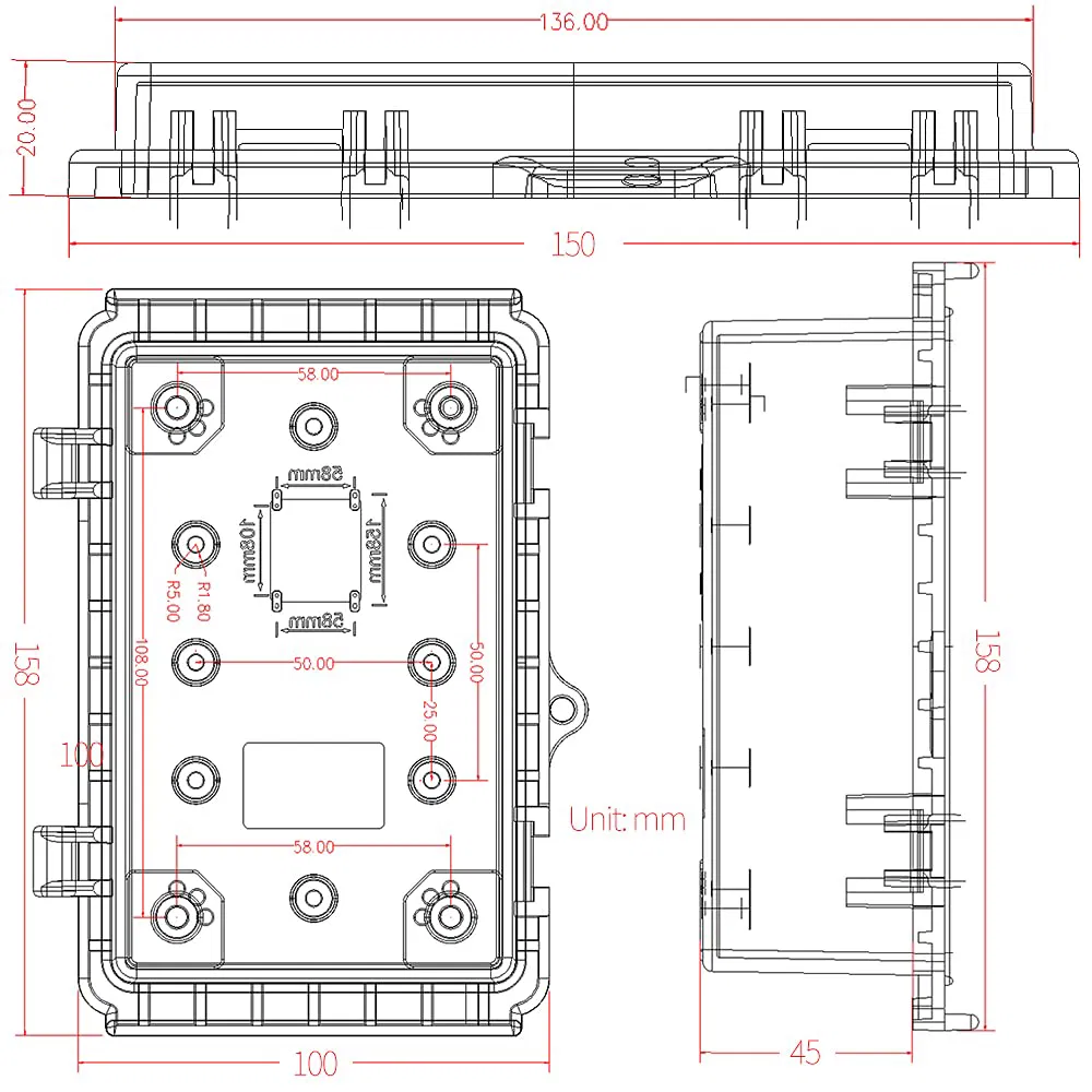 Giá gắn có khoảng cách tâm lỗ là 58 mm x 108 mm, giúp bắt vít dễ dàng và khớp hoàn hảo với các lỗ trên hộp.