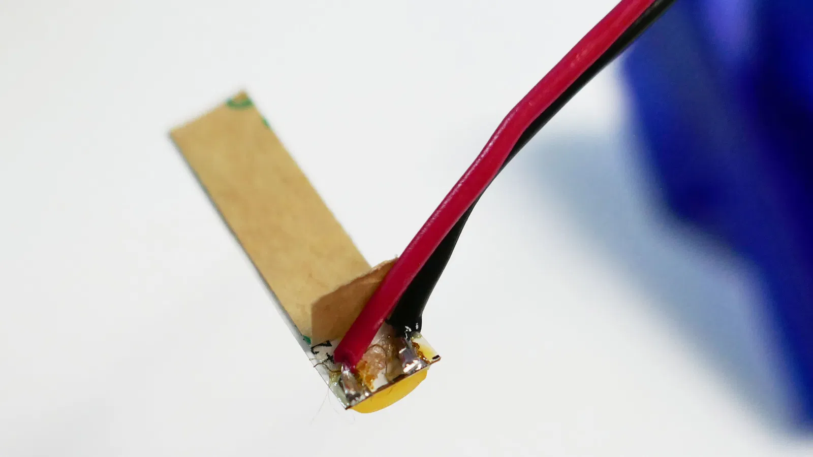Sử dụng đầu nối cái JST ZH kèm dây 150mm, hàn thiếc hai đầu dây. Luồn dây qua lỗ trên ống dẫn gió mới. Trên dải LED, bóc lớp bảo vệ ở chỗ đánh dấu cực. Cạo sạch keo trên hai miếng đồng để hàn. Hàn dây vào, bẻ vuông góc 90 độ sao cho dây hướng vào tâm dải đèn. Dây đỏ nối vào +24V, dây đen vào cực âm. Cắt bỏ phần dây thừa.