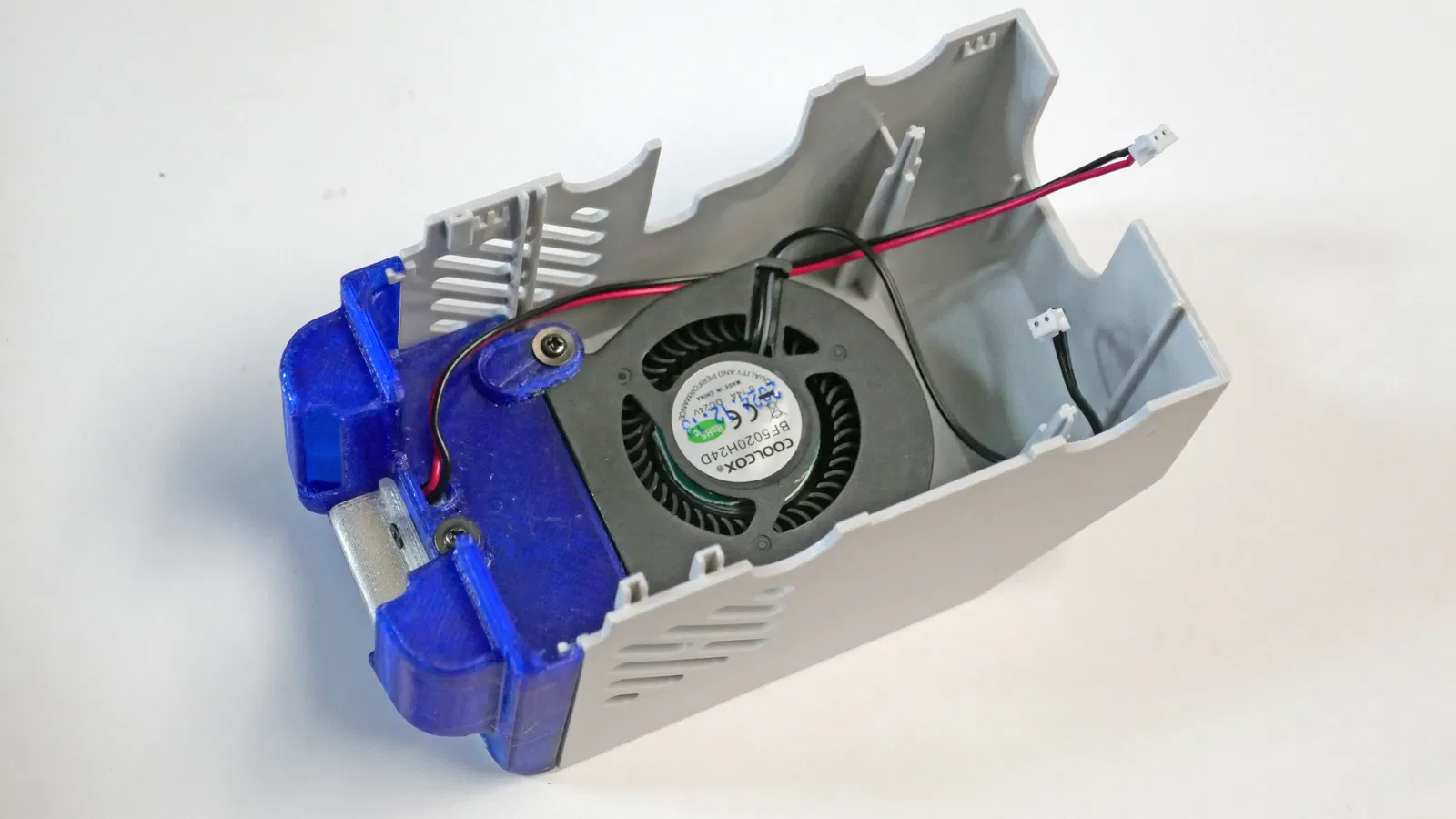 Tháo nắp sau (4 ốc T20). Rút đầu nối quạt F1 từ mạch điện. Cắm cáp ngắn vào cổng này, rồi cắm quạt vào cáp. Luồn dây 150mm lên trên và xuống phía trước giống như dây quạt mẫu, kẹp dưới các lẫy nhựa để không bị vướng nắp.