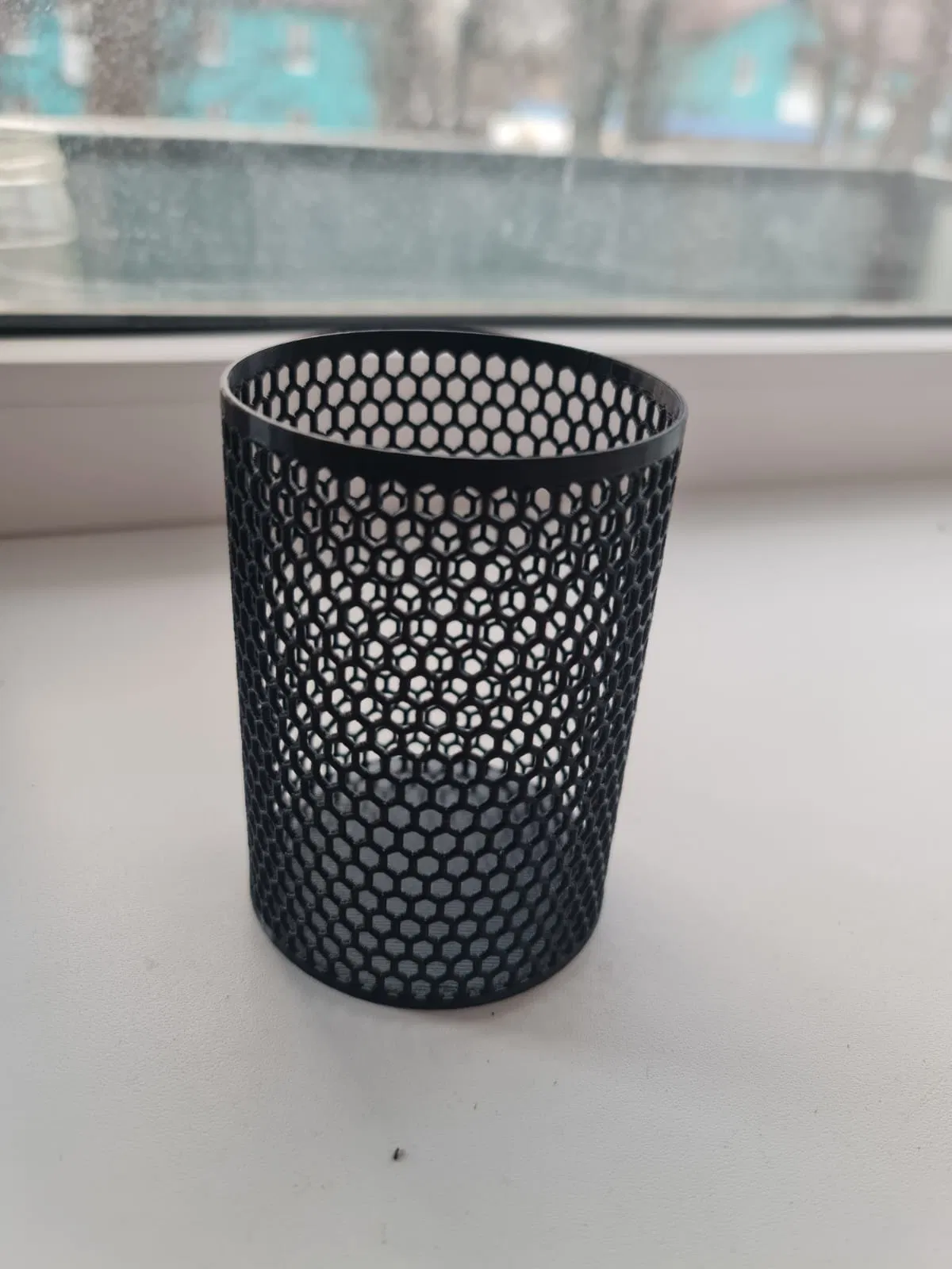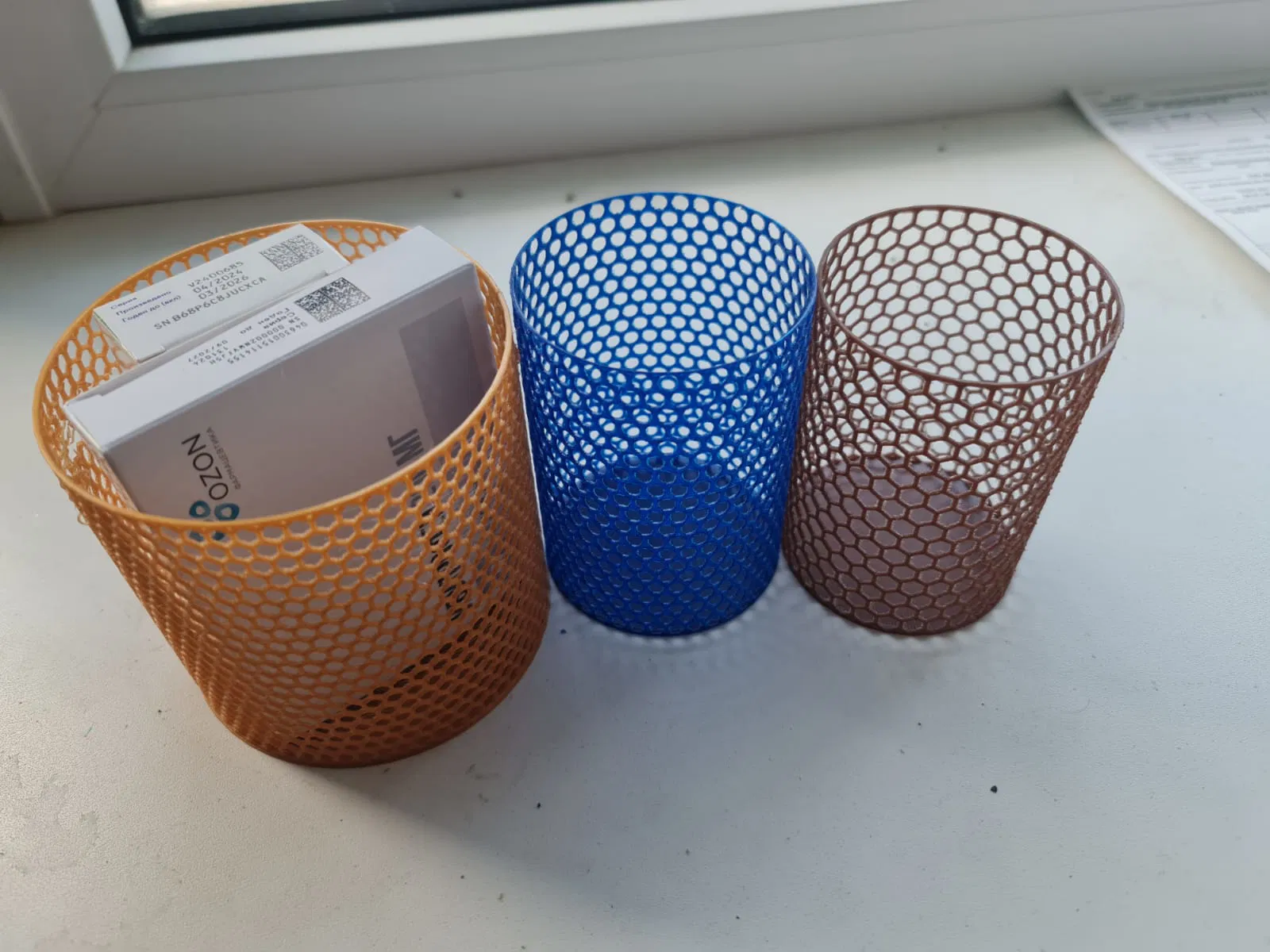 Thiết kế tổ ong giúp tối ưu lượng nhựa in, cực kỳ tiết kiệm. Phù hợp cho đầu phun 0.4mm. Nếu dùng đầu phun lớn hơn, vui lòng scale lên 25%. Mẫu in tạo ra ống đựng đồ chắc chắn và đẹp mắt cho bàn làm việc của bạn.
