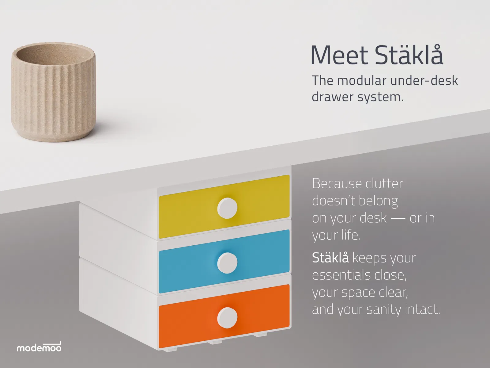 Giới thiệu Stäklå. Một hệ thống ngăn kéo tối giản, dạng mô-đun được thiết kế để giải phóng không gian bàn làm việc của bạn — hoặc đặt gọn gàng ngay trên bàn.