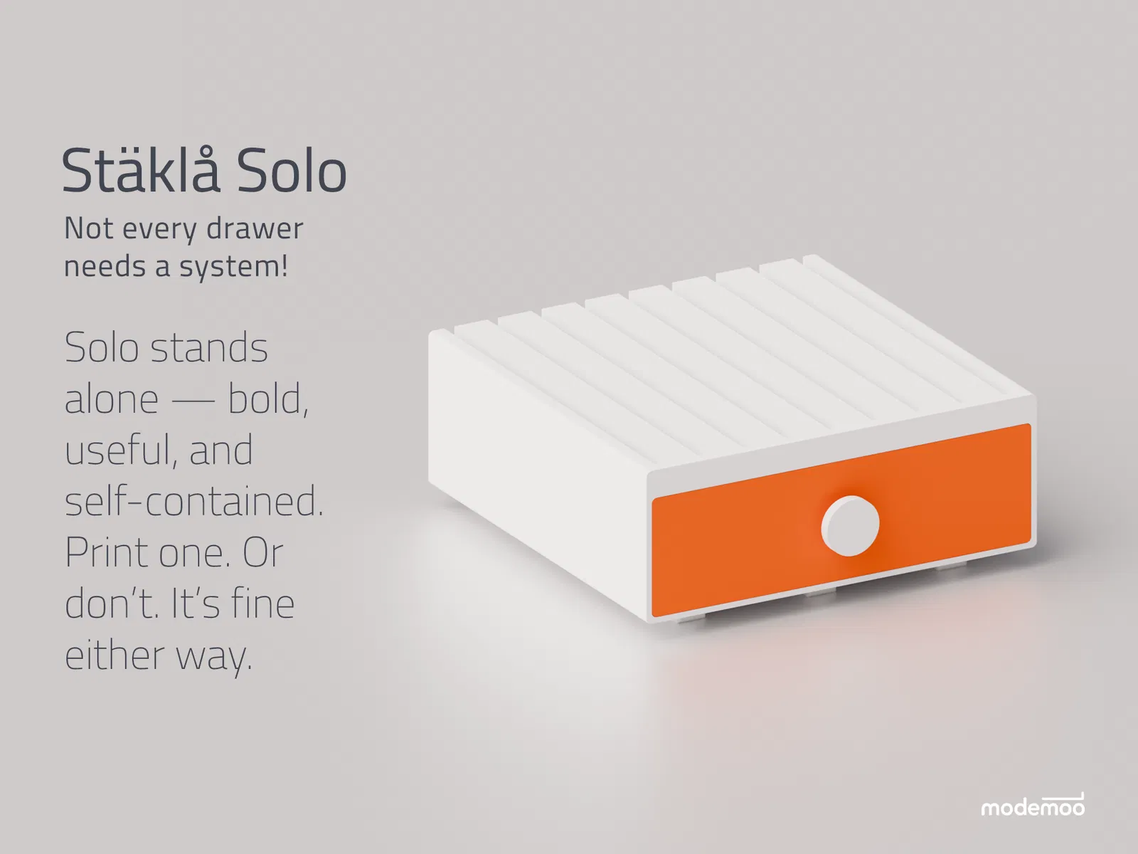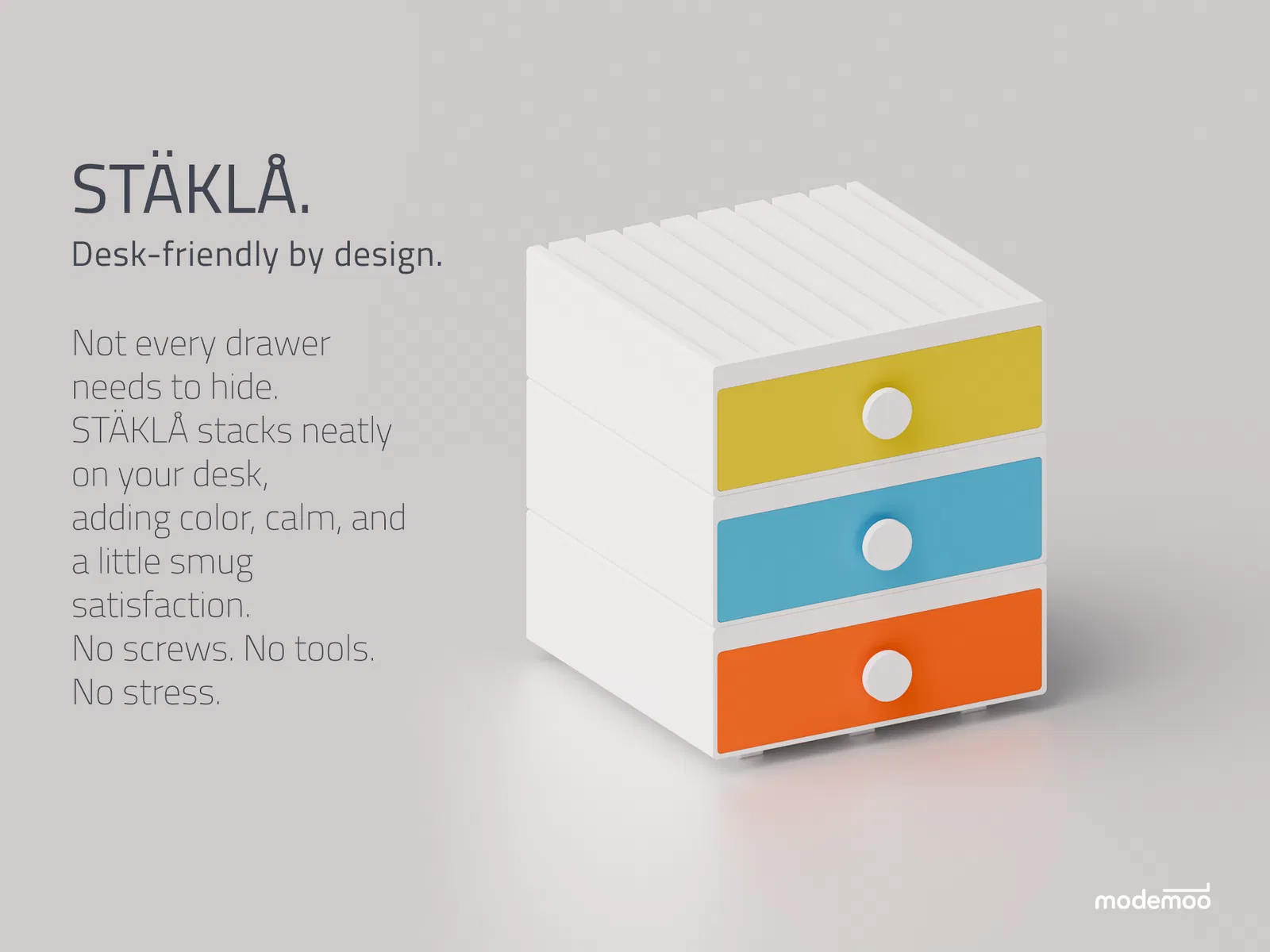Stäklå là hệ thống ngăn kéo mô-đun tối giản, giúp bạn giải phóng không gian bàn làm việc. Thiết kế thông minh cho phép xếp chồng dễ dàng, gắn dưới gầm bàn hoặc đặt trên bàn với khả năng in 3D không cần support, phù hợp cho mọi nhu cầu lưu trữ.