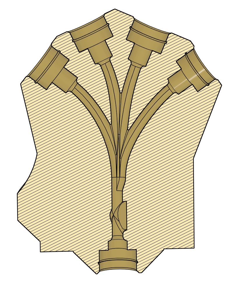 - Khoảng cách giữa các đầu vào được mở rộng giúp mình thiết kế lại phần giao điểm: Giao điểm của lane 2 và 3 được dời lên trên, cho phép đường dẫn filament của lane 1 và 4 dài hơn và ổn định hơn trước khi chạm vào điểm giao thứ hai.