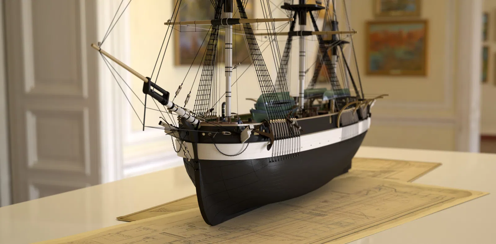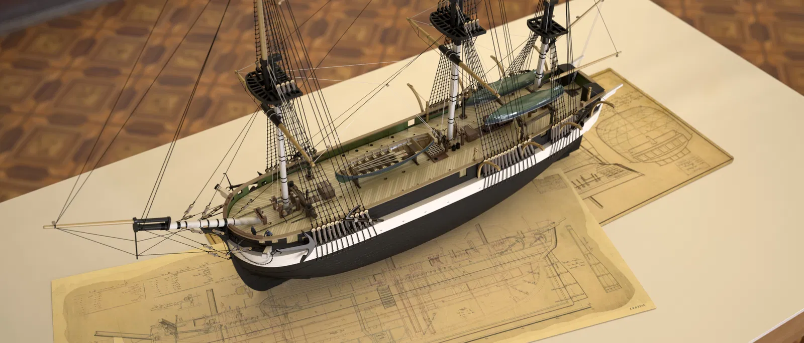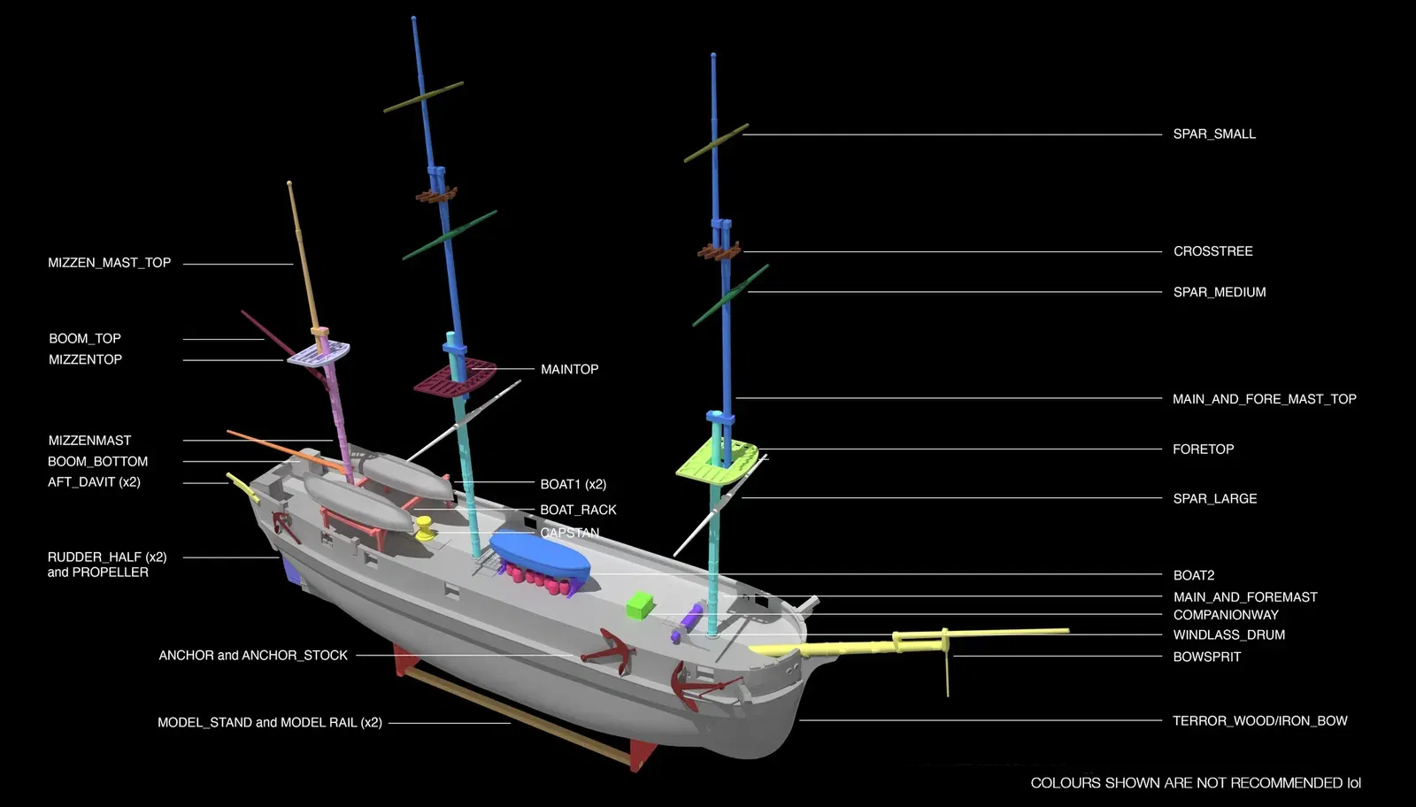 Các bộ phận như xà treo neo (catheads), mũi tàu và các tấm ốp hông cabin giờ đây được tách rời để in dễ dàng hơn