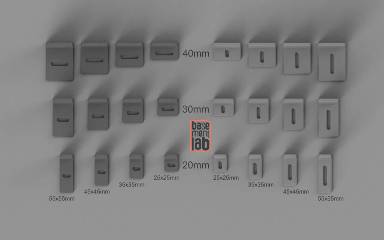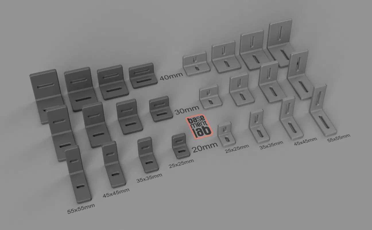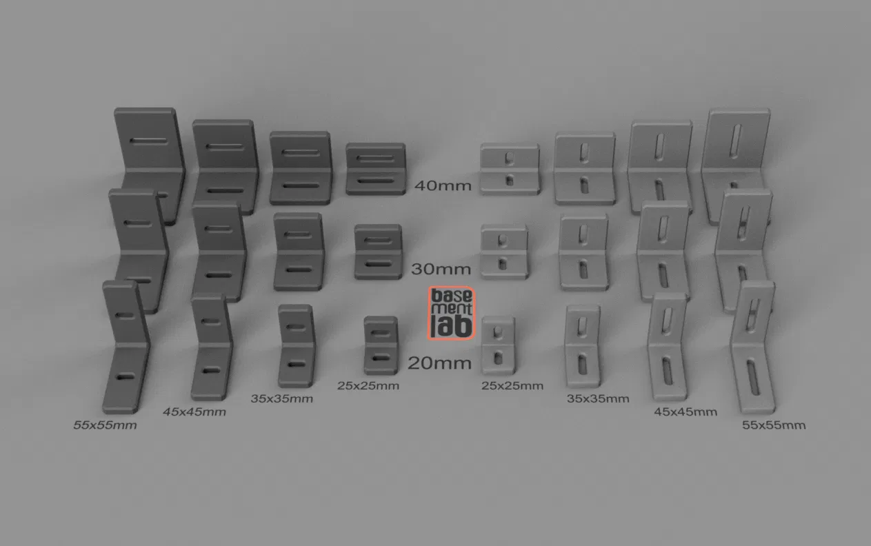 Bộ sưu tập các mẫu pat góc (L bracket) tích hợp khe điều chỉnh, hỗ trợ các kích thước từ 20mm đến 40mm. File thiết kế sẵn sàng để in 3D, hỗ trợ tùy chỉnh kích thước dễ dàng cho mọi dự án DIY của bạn.