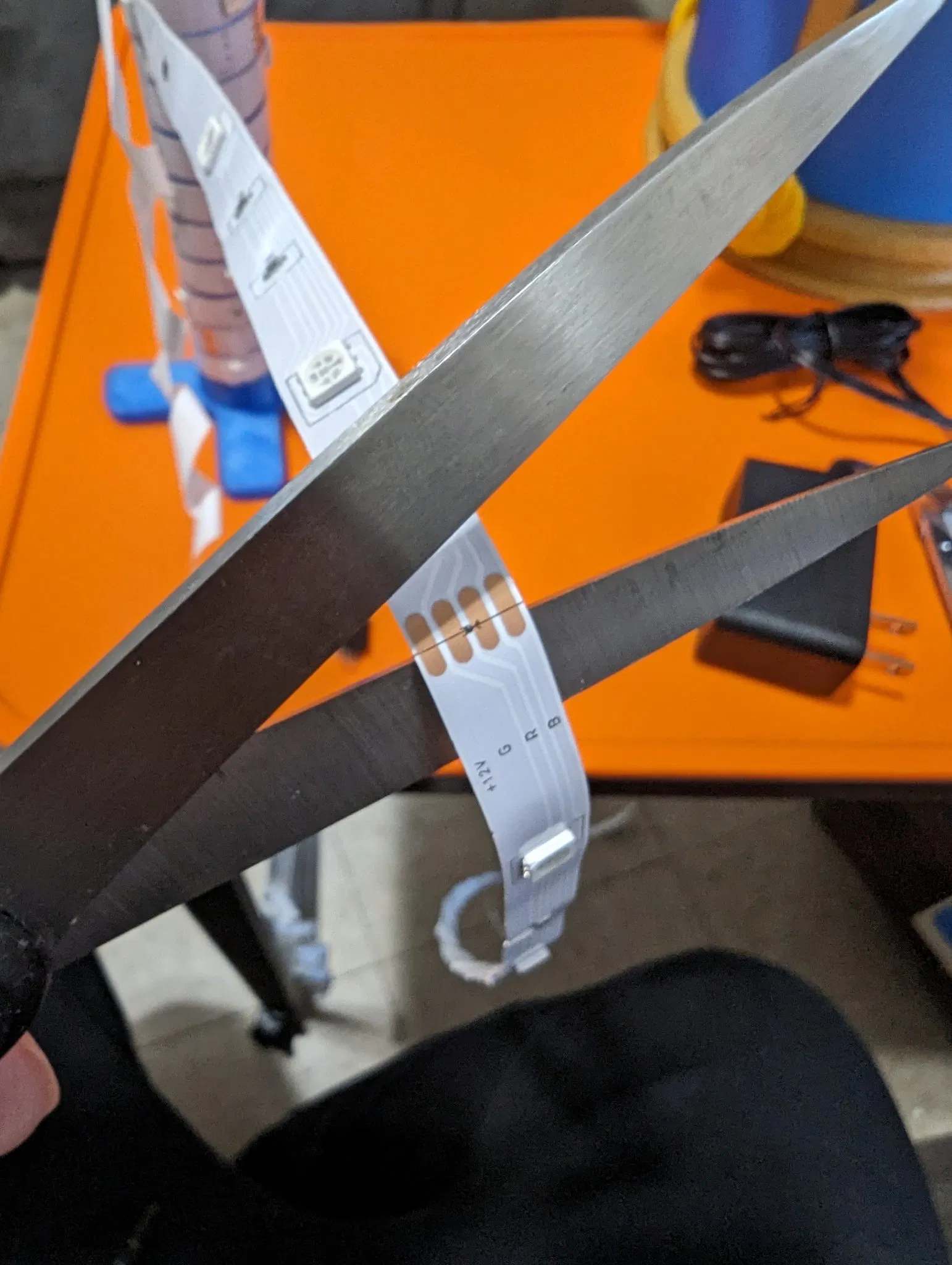 - Cắt bỏ phần dải LED thừa. ***Không cắt mạch. Cắt ở một trong các đoạn có 4 hình bầu dục màu nâu.*** Như được hiển thị trong hình có kéo cắt dải LED.