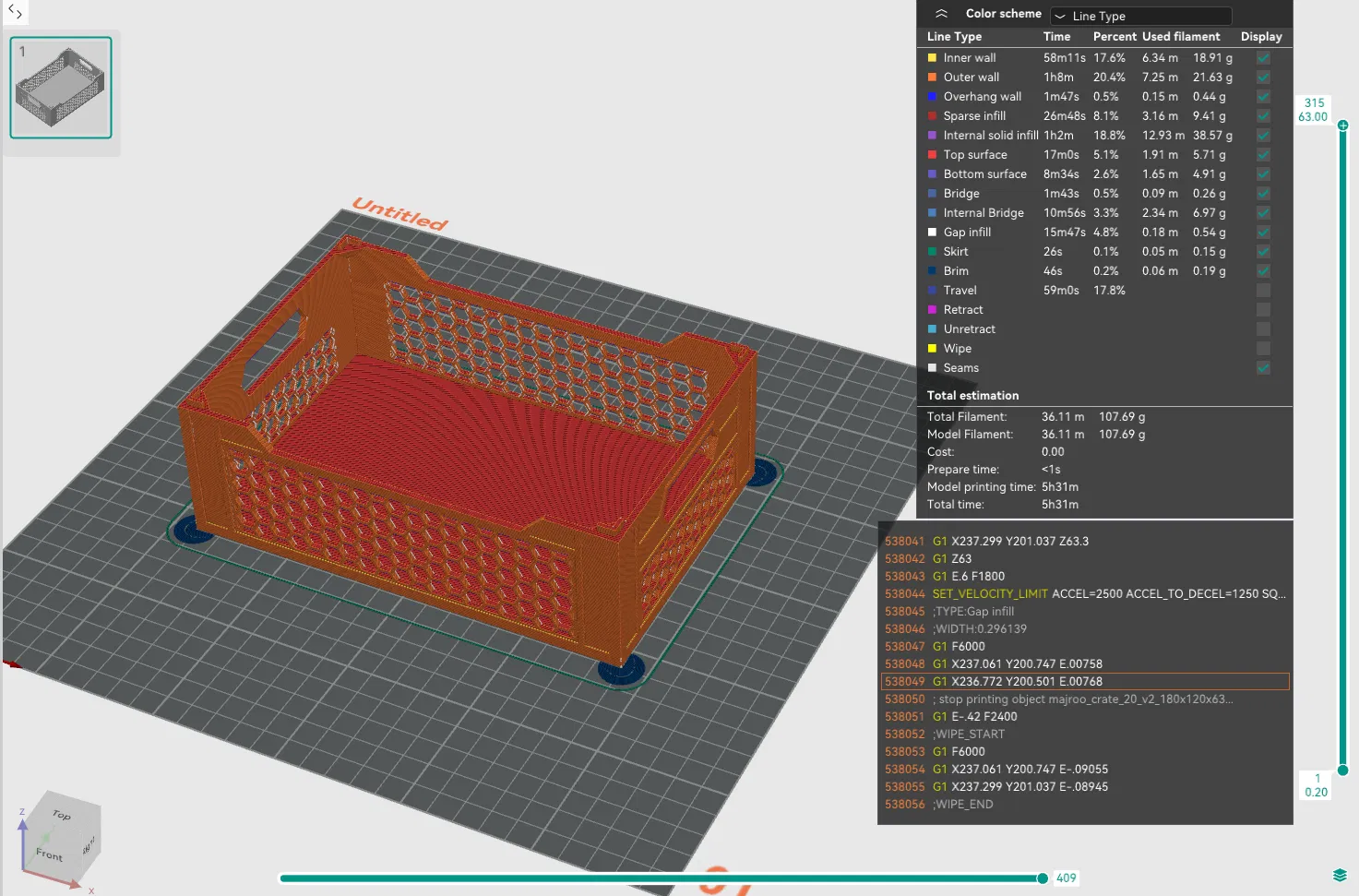 Lưu ý: Mẫu thùng mới (màu trắng) có thành mỏng hơn 1.25 mm và đáy mỏng hơn khoảng 1.5 mm. Trong hình chụp từ slicer, bạn có thể thấy sự khác biệt về lượng vật liệu tiêu thụ với cùng thiết lập in. Ngoài ra, mình cũng đã bo tròn nhẹ các cạnh bên ngoài! Có thể in không cần support!