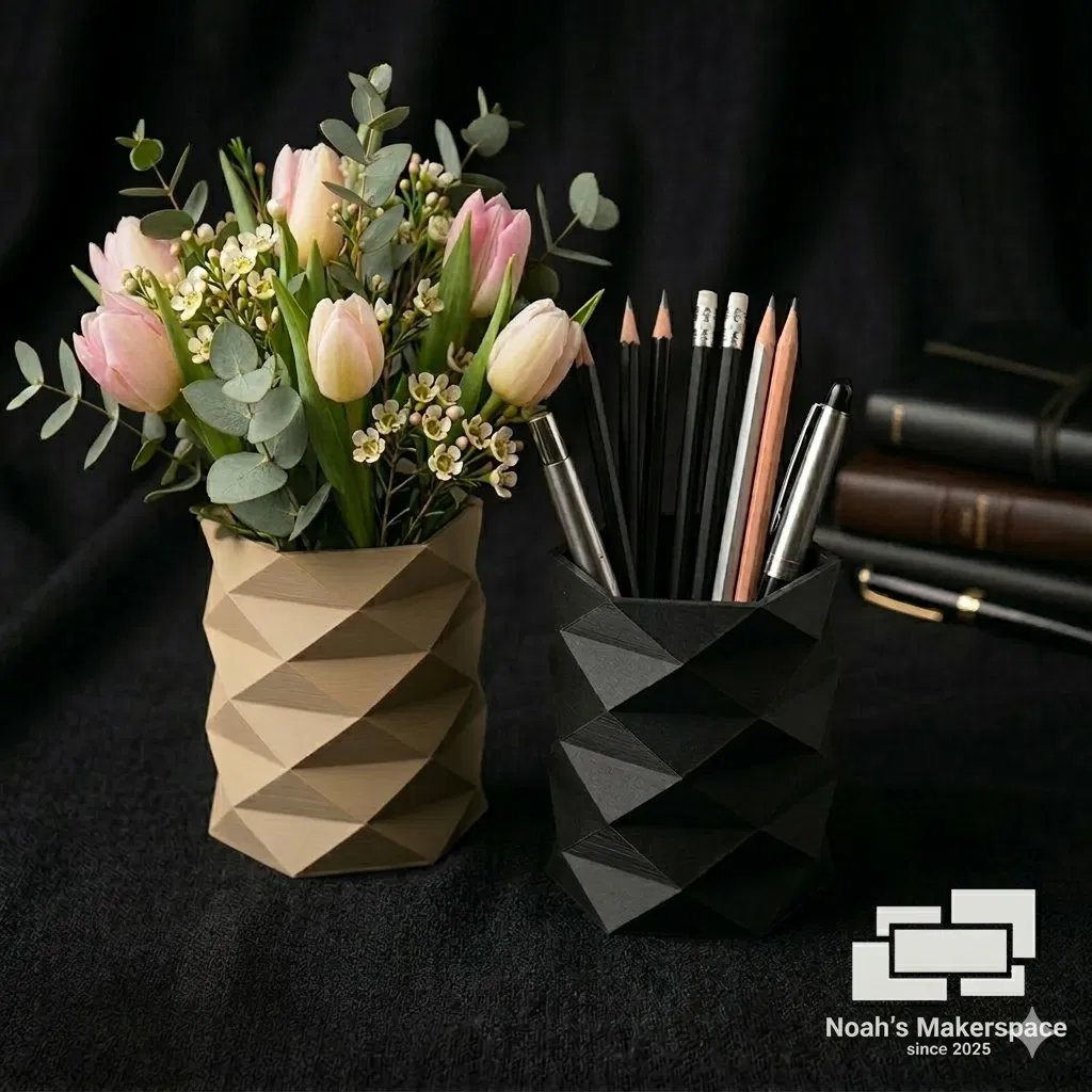 Khám phá mẫu bình hoa 3D độc đáo với thiết kế hình học bắt mắt, mang lại vẻ đẹp hiện đại và sang trọng cho mọi không gian. Sản phẩm này không chỉ là vật trang trí hoàn hảo cho những đóa hoa tươi thắm, mà còn là giải pháp lưu trữ thông minh cho bút viết và đồ dùng văn phòng phẩm trên bàn làm việc. Với cấu trúc tối ưu cho kỹ thuật in vase mode, mẫu thiết kế này dễ dàng thực hiện bằng chất liệu PLA, đảm bảo sự sắc nét trong từng chi tiết tam giác nổi bật. Đây là món đồ decor không thể thiếu cho những ai yêu thích sự sáng tạo, gọn gàng và muốn tự tay tạo ra những sản phẩm cá tính cho chính ngôi nhà của mình.