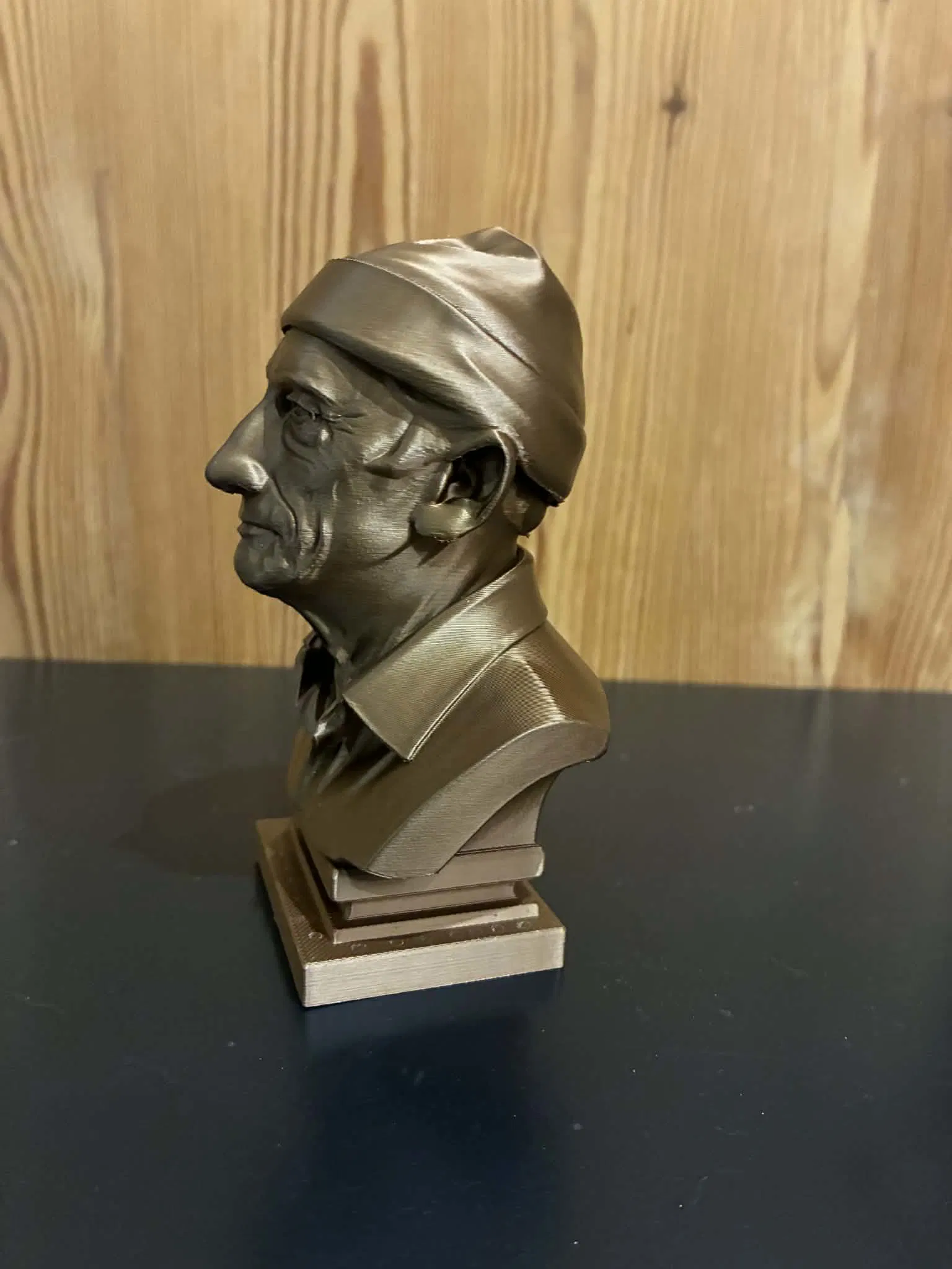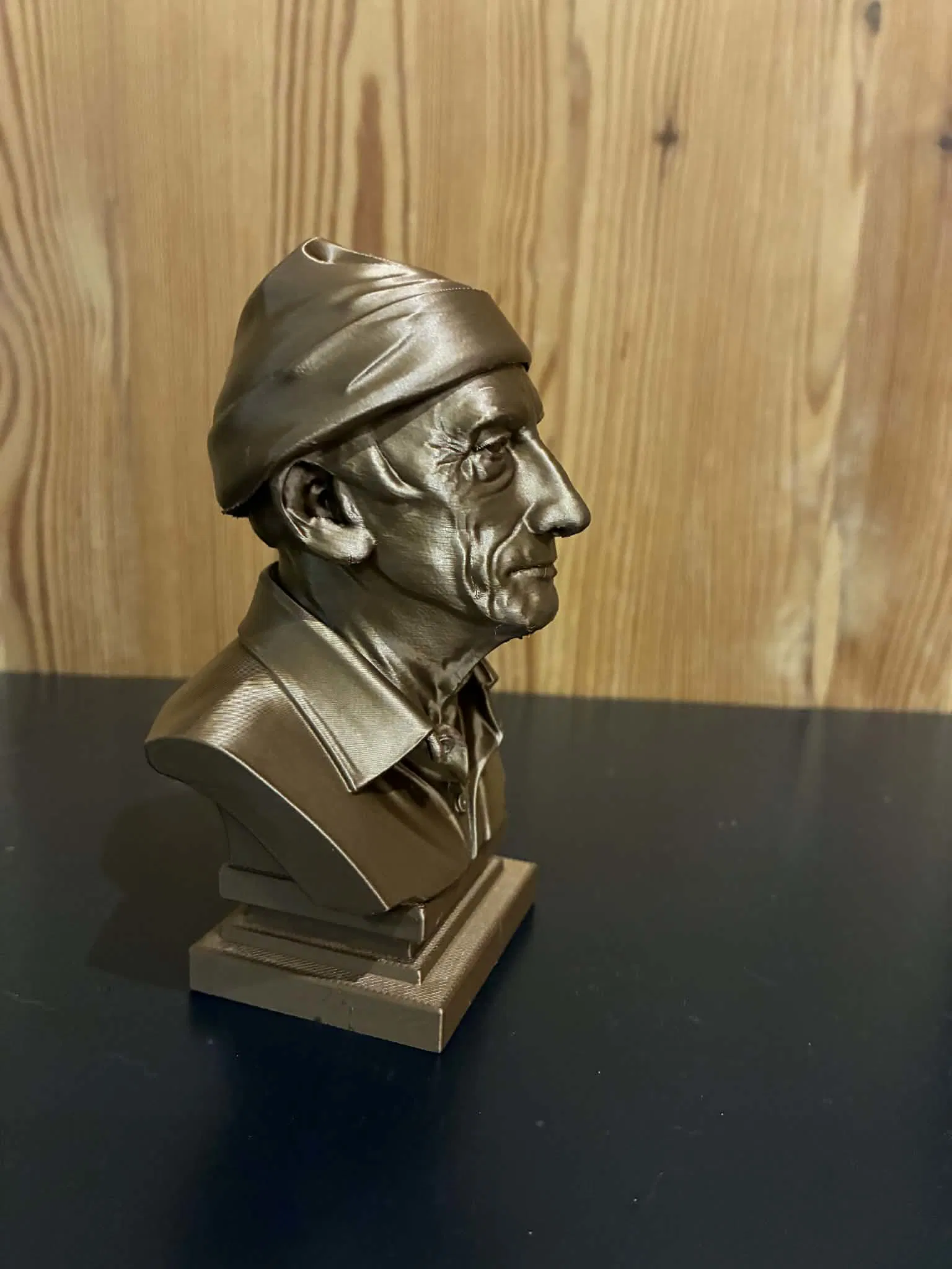 Khám phá bức tượng bán thân tuyệt đẹp của Chỉ huy Jacques-Yves Cousteau, nhà thám hiểm đại dương huyền thoại. Tác phẩm được thiết kế tối ưu cho in 3D, tái hiện sống động chiếc mũ đỏ và ánh nhìn đầy khát vọng của ông.