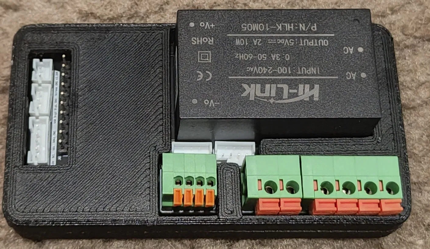 - Các lỗ khoét được cắt chính xác cho module nguồn Hi-Link HLK-10M05 và các khối terminal, đảm bảo việc đi dây nhanh chóng, gọn gàng.