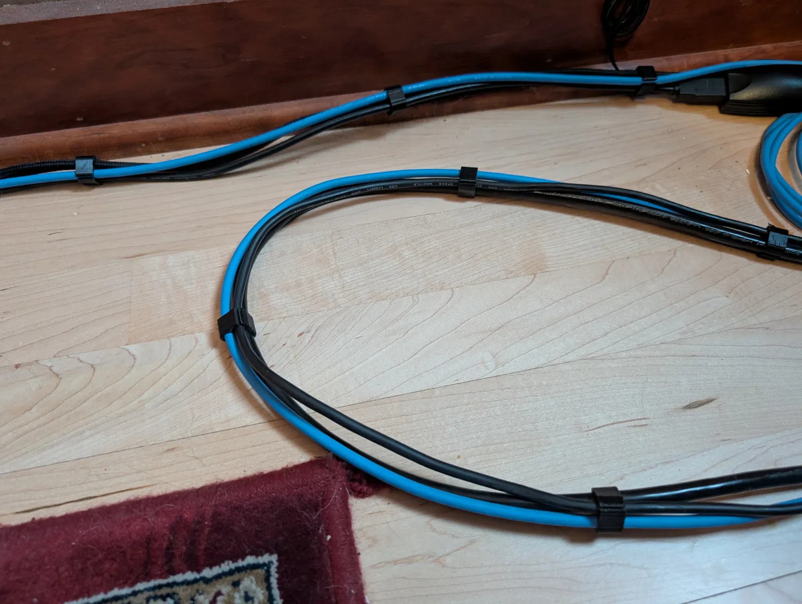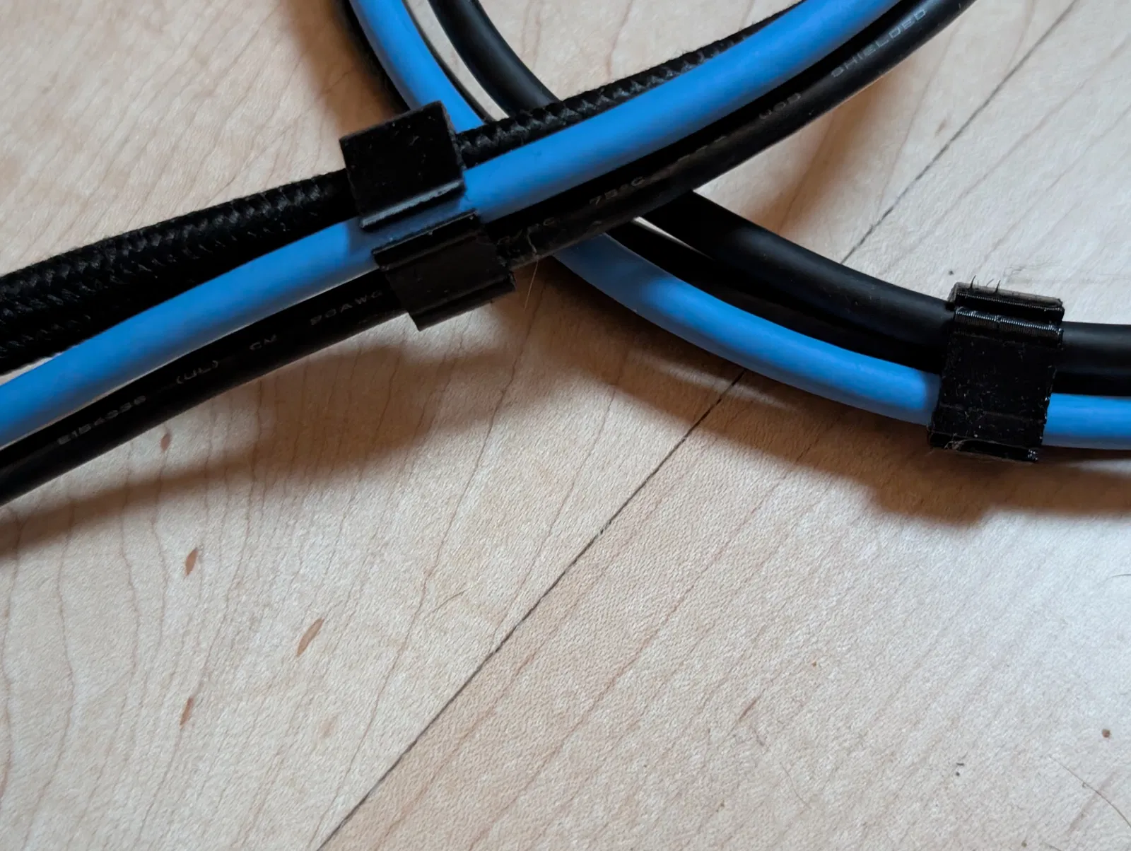 Mình làm mấy cái kẹp này để gom gọn dây cáp từ bàn pedal guitar sang ampli. Bộ dây của mình gồm dây nguồn, dây tín hiệu digital và một sợi USB. Mình tự thiết kế và in mấy cái kẹp này bằng nhựa TPU để giữ các dây lại với nhau cho gọn, cáp nằm rất chắc chắn trong kẹp.