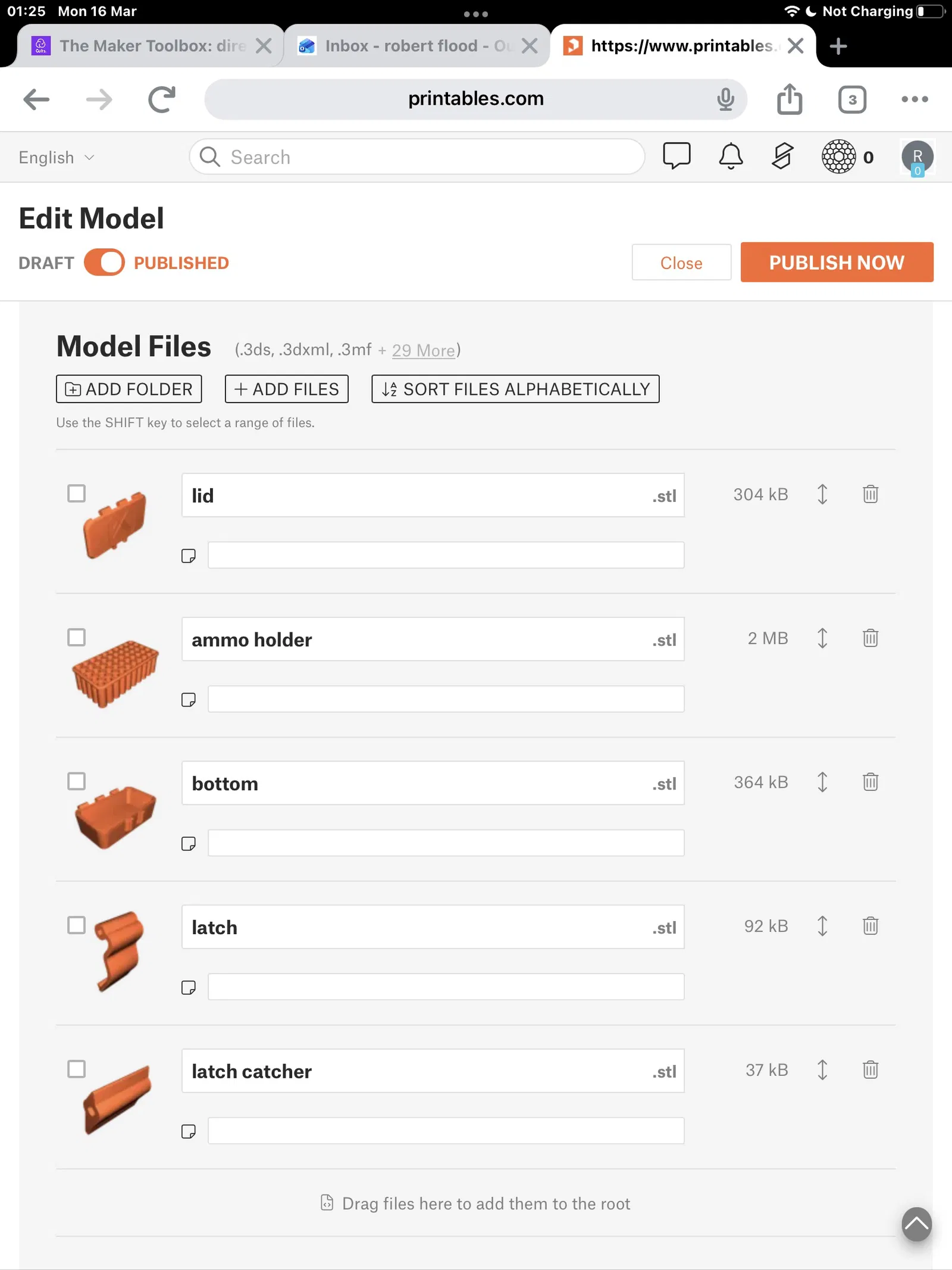 Sản phẩm này được chia thành nhiều tệp STL riêng biệt bao gồm khay chính, nắp đậy, phần đáy, chốt khóa (latch) và khớp cài chốt (latch catcher). Việc lắp ráp khá đơn giản, cho phép bạn tự in và hoàn thiện tại nhà một cách dễ dàng. Mẫu thiết kế này không chỉ tập trung vào vẻ ngoài thẩm mỹ mà còn chú trọng đến tính ứng dụng cao, đảm bảo rằng nắp hộp được khóa chặt, tránh rơi rớt đạn ra ngoài trong quá trình di chuyển.