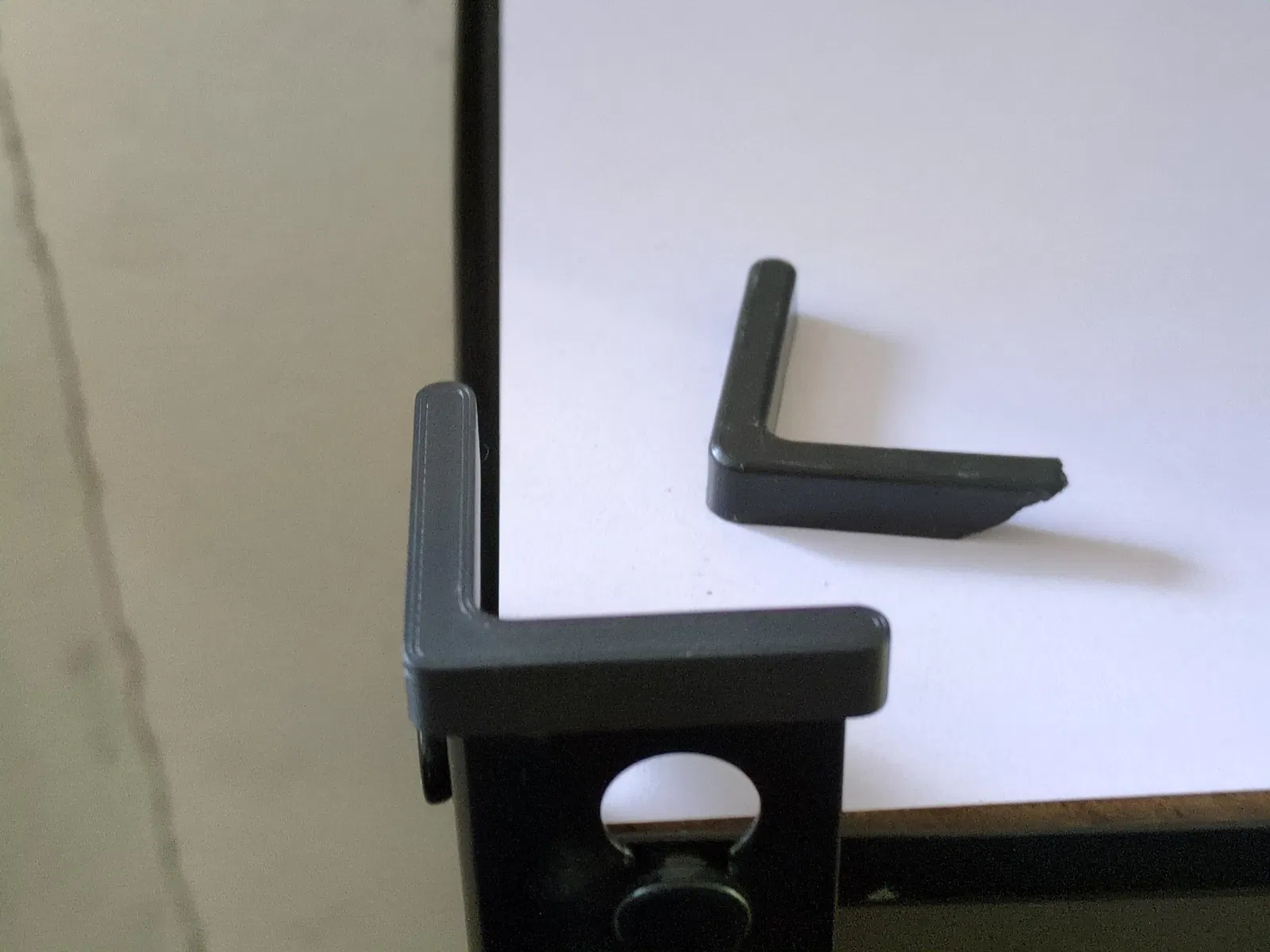 Trong lúc giúp một người bạn lắp ráp mấy cái kệ của hãng King's Rack, mình lỡ tay làm hỏng một trong những nắp bịt đầu (endcap). Đây là loại nắp dùng để che các cạnh sắc nhọn ở đầu các thanh trụ đứng, giúp bảo vệ an toàn khi lắp ráp. Lúc đó mình dùng búa cao su không đúng cách nên làm nó bị mẻ, rồi suýt nữa thì làm mất tiêu luôn (may mà bạn mình tìm thấy trước khi mình về).