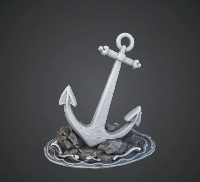Những đường khắc trang trí cùng các đường nét kim loại mượt mà mang đến cho chiếc mỏ neo vẻ đẹp hàng hải đầy sang trọng, trong khi các chi tiết đá và nước xung quanh tạo nên bề mặt tự nhiên đầy sống động. Cách bố trí nghiêng làm cho tác phẩm trở nên đầy sức sống, như thể nó vừa được thả xuống từ một con tàu phía trên.