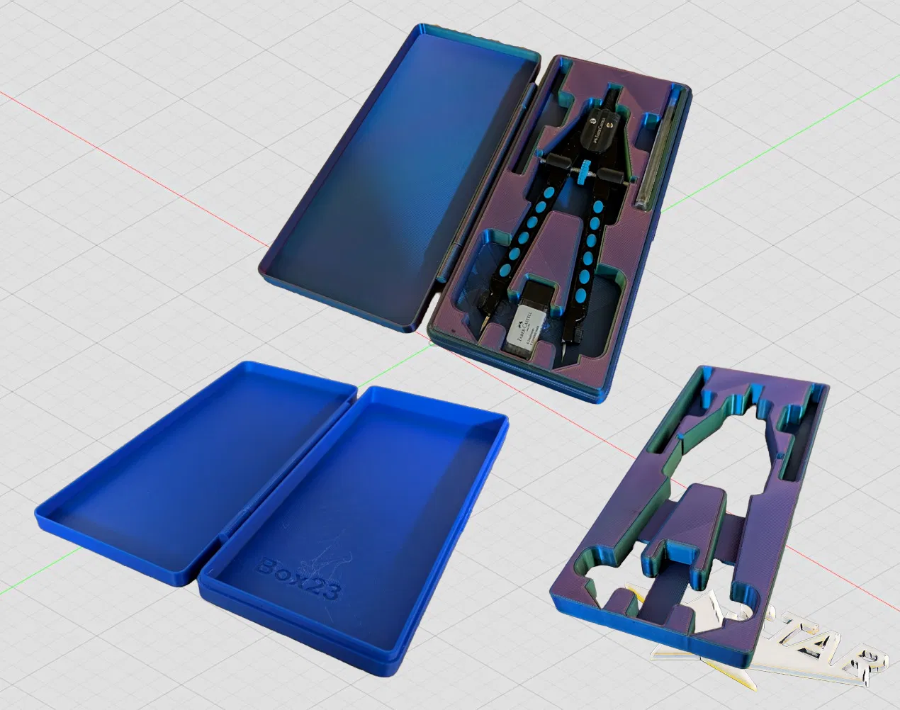 Mẫu hộp đựng được thiết kế chuyên dụng cho các loại compa Faber-Castell dòng Schnellverstellzirkel Factory 174340 và Grip 2001. Thiết kế in tại chỗ (Print in place) vô cùng tiện lợi và dễ thực hiện.