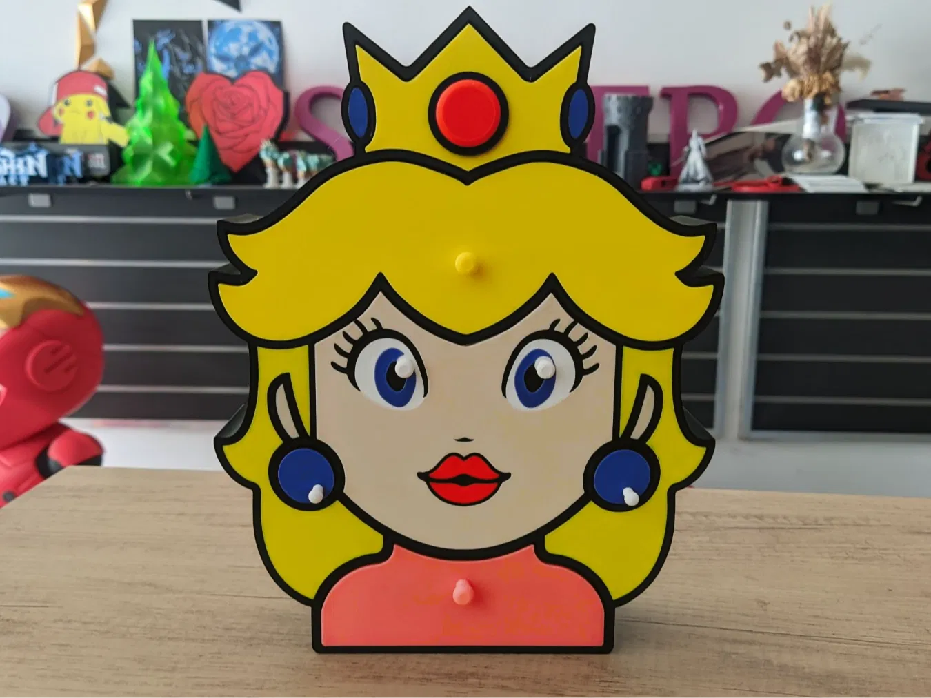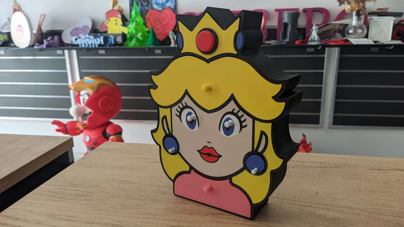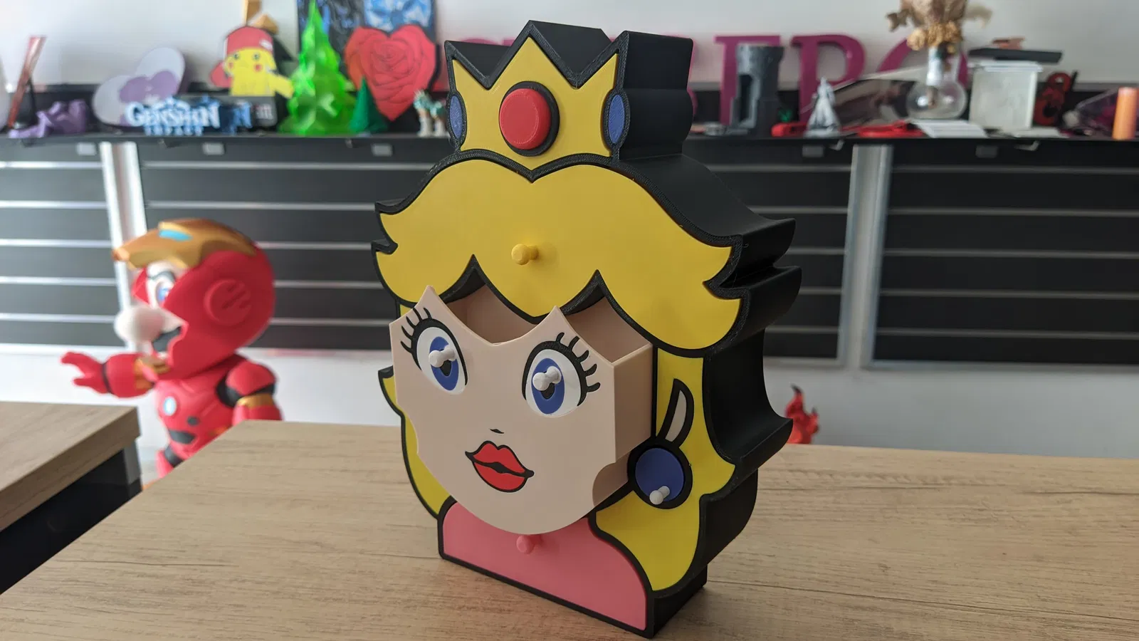 Làm mới không gian của bạn với chiếc hộp trang sức lấy cảm hứng từ Công chúa Peach, vị quân chủ đáng yêu từ Vương quốc Nấm! Dù bạn là một fan cứng của Mario hay chỉ đơn giản là yêu thích những món đồ trang trí độc đáo theo phong cách nhân vật, thiết kế vừa tiện dụng vừa tinh nghịch này chắc chắn sẽ trở thành tâm điểm trên bàn trang điểm, kệ sách hay phòng chơi game của bạn.