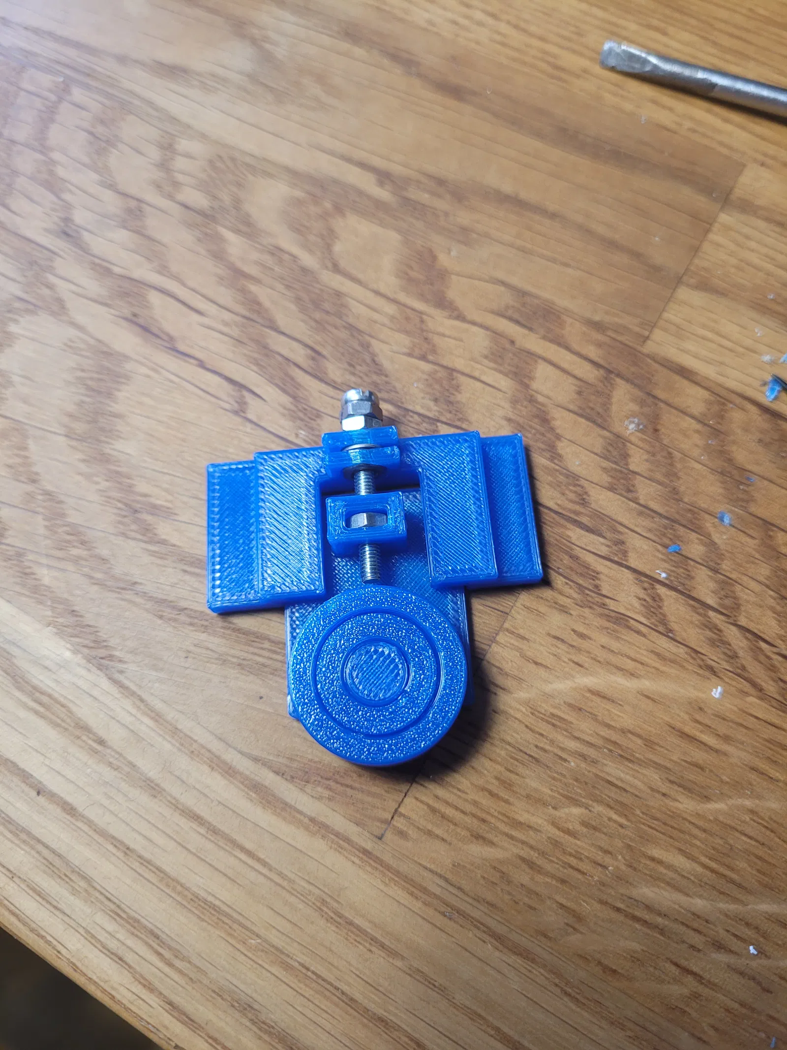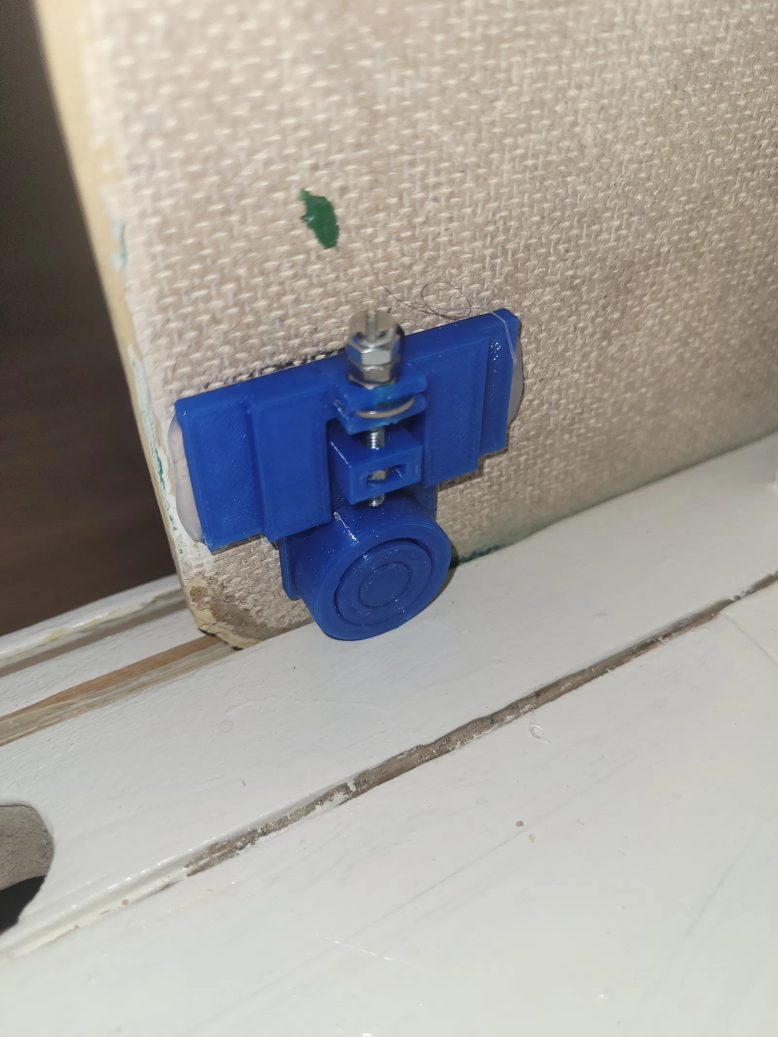 Bây giờ bạn chỉ cần vặn hai phần lại với nhau như hình. Nếu nới lỏng vít, bánh xe sẽ bị đẩy ra xa hơn; nếu siết chặt, nó sẽ kéo lại gần. Đây là cách điều chỉnh để cánh cửa nhấc lên khỏi đáy ray, nhưng không quá cao để bị trượt khỏi ray.