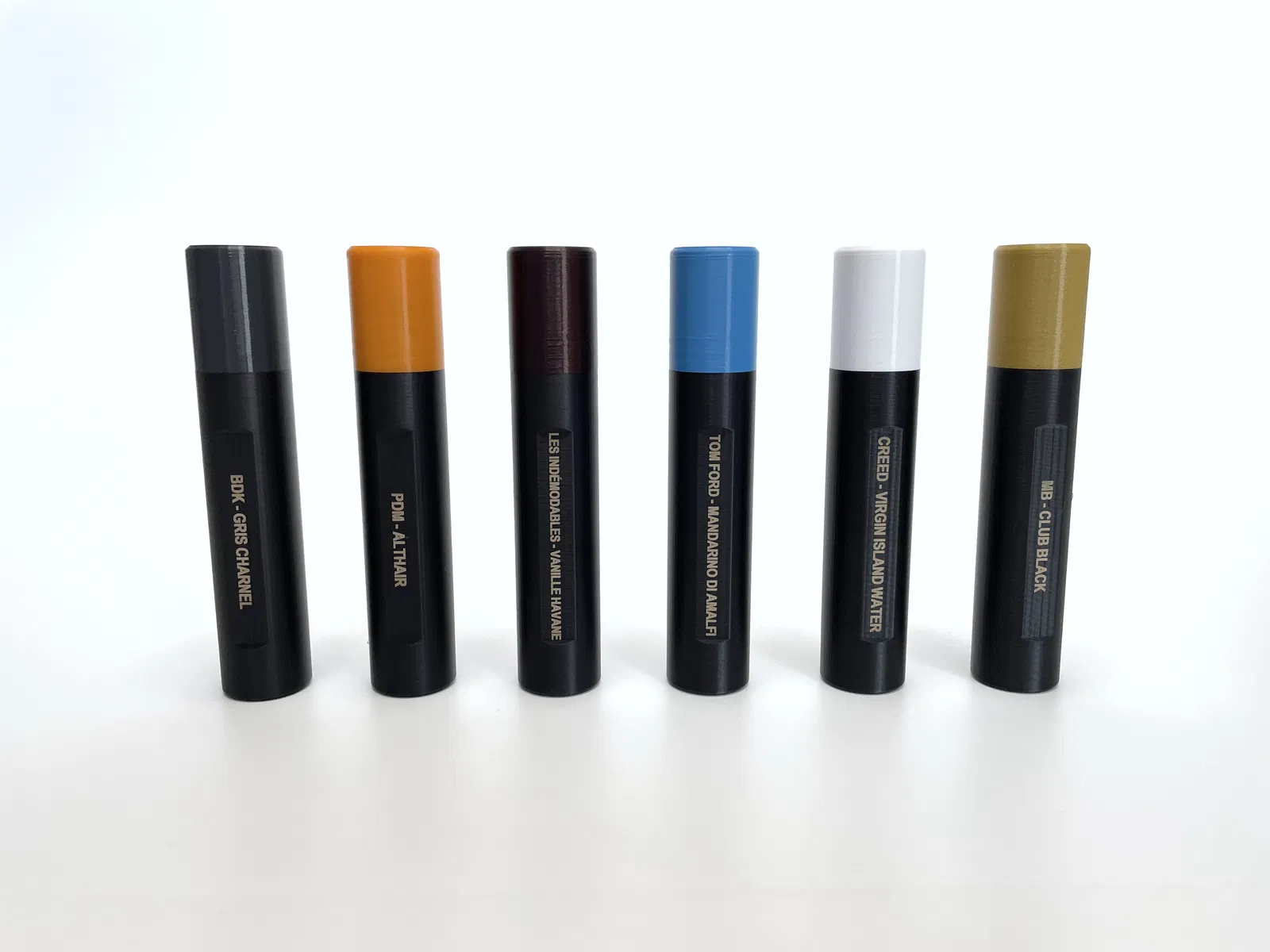 Mình dùng nắp có các màu khác nhau để dễ dàng phân biệt các loại nước hoa bên trong. Bạn cũng có thể khắc tên nước hoa lên vỏ, hoặc đơn giản là dùng bút đánh dấu hay dán nhãn là được.