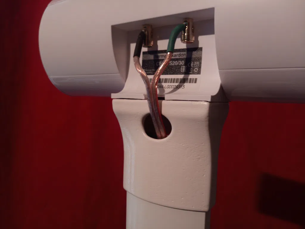 Sản phẩm này không chỉ đơn thuần là một khớp nối mà còn tích hợp khe luồn dây loa cực kỳ tiện lợi ngay phía sau. Nhờ thiết kế này, bạn có thể giấu gọn các dây dẫn, giúp không gian bày trí thiết bị âm thanh trở nên ngăn nắp và chuyên nghiệp hơn rất nhiều. Sau khi in xong, bạn hoàn toàn có thể xử lý bề mặt bằng cách chà nhám nhẹ và phun sơn theo màu sắc yêu thích để hài hòa với tổng thể bộ dàn âm thanh Harman Kardon của mình.