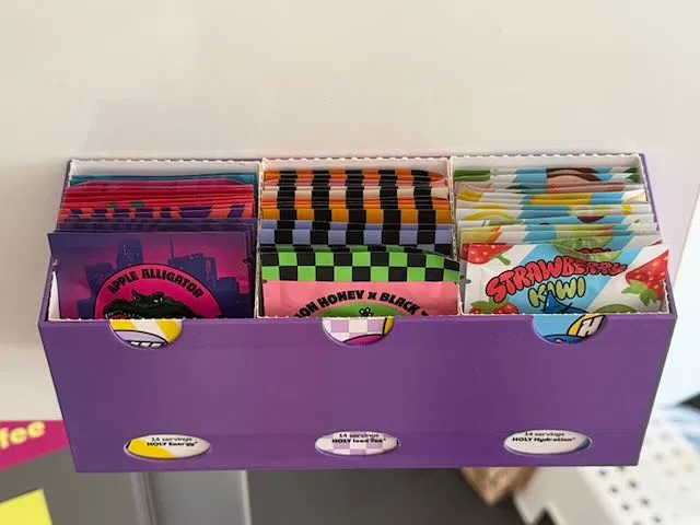 Chiếc hộp nhỏ tiện lợi được thiết kế để gắn bên trong tủ bếp, giúp bạn cất gọn ba hộp mẫu bột pha nước HOLY (Ice Tea, Energy, Hydration). Thiết kế đơn giản, in ấn không cần support.