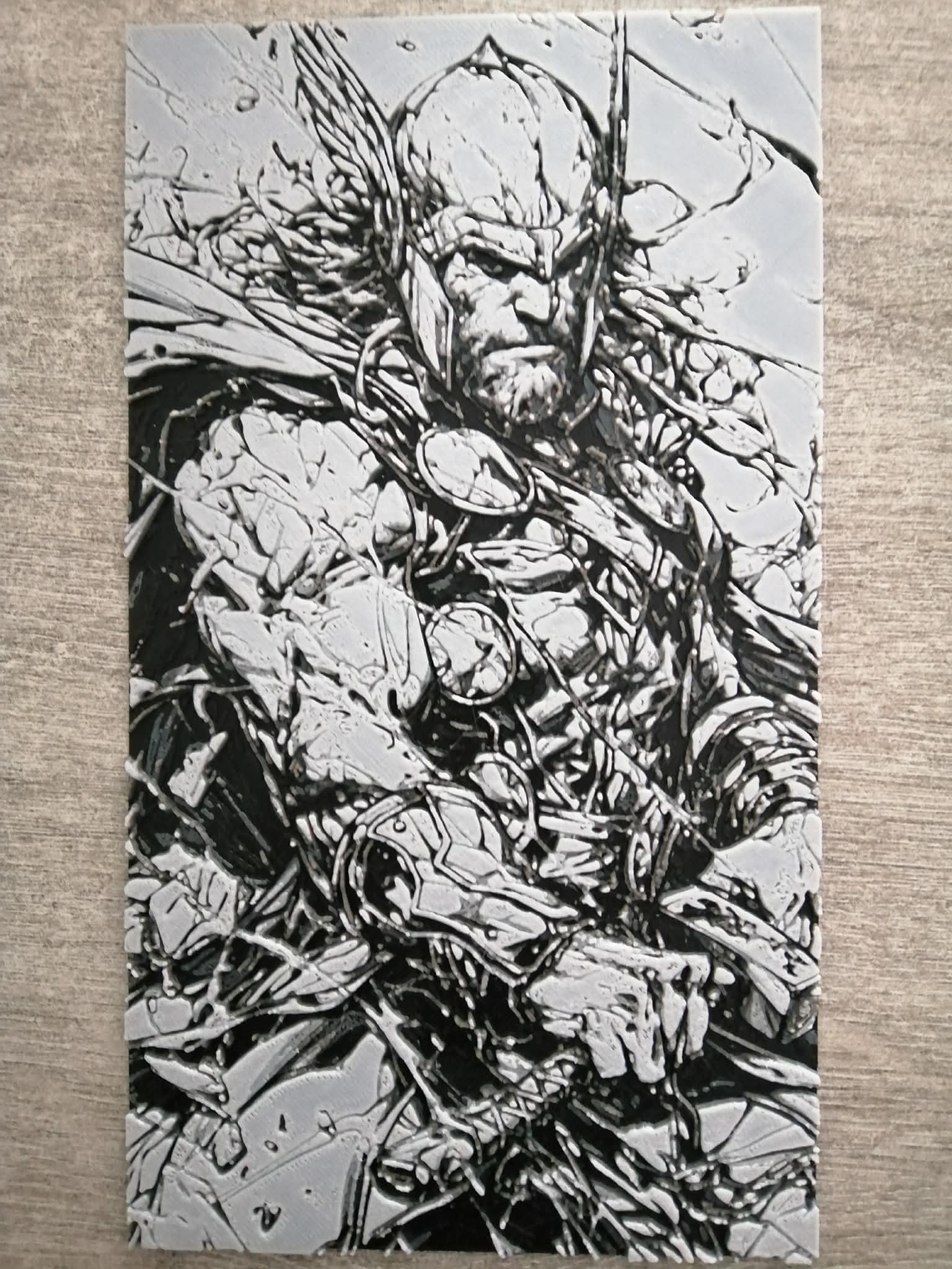 Bạn là fan của các siêu anh hùng Marvel và đặc biệt yêu thích vị thần sấm Thor? Nếu vậy, mẫu tranh 3D theo công nghệ Hue Forge này chắc chắn sẽ làm bạn hài lòng. Đây không chỉ là một bức tranh trang trí thông thường mà là một tác phẩm nghệ thuật kỹ thuật số được chuyển đổi tinh tế để in bằng máy in 3D. Với các đường nét khắc họa chi tiết, từ bộ giáp chiến binh cho đến khuôn mặt đầy uy lực của Thor, sản phẩm này khi hoàn thiện sẽ tạo ra hiệu ứng chiều sâu vô cùng ấn tượng trên bề mặt phẳng.
