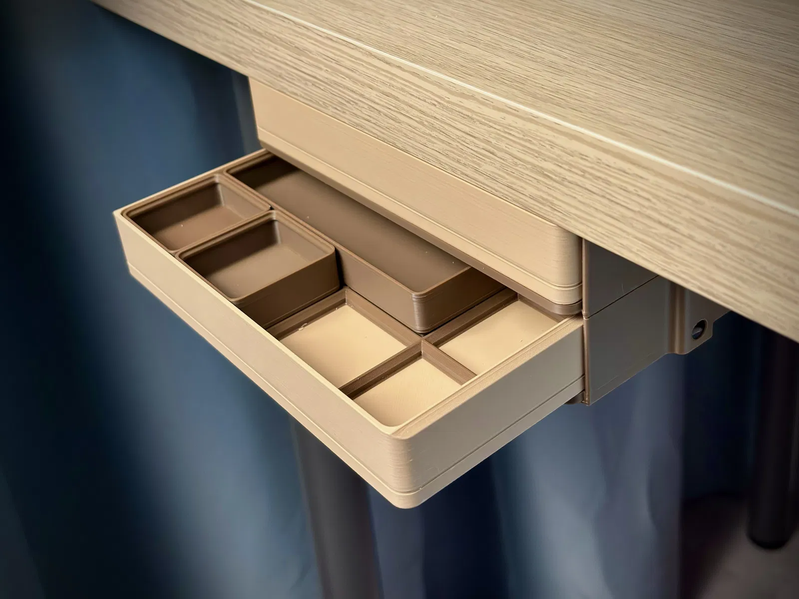 Ngăn kéo gắn gầm bàn với layout Gridfinity 4×2 giúp góc làm việc của bạn trở nên gọn gàng, thông minh hơn. Thiết kế module xếp chồng linh hoạt, cơ chế mở bằng nhấn (push lock) tiện lợi cho mọi không gian làm việc. 🚀