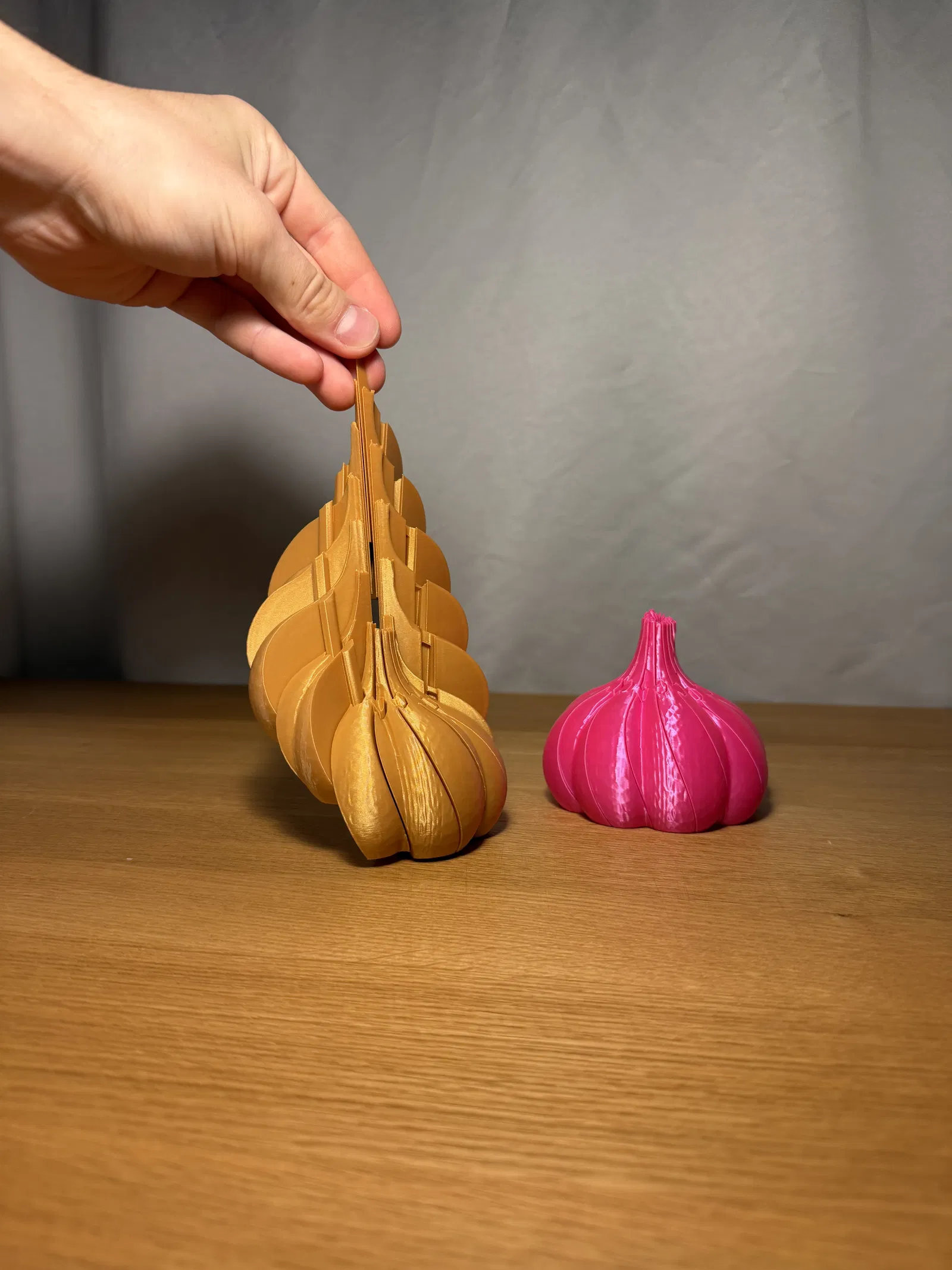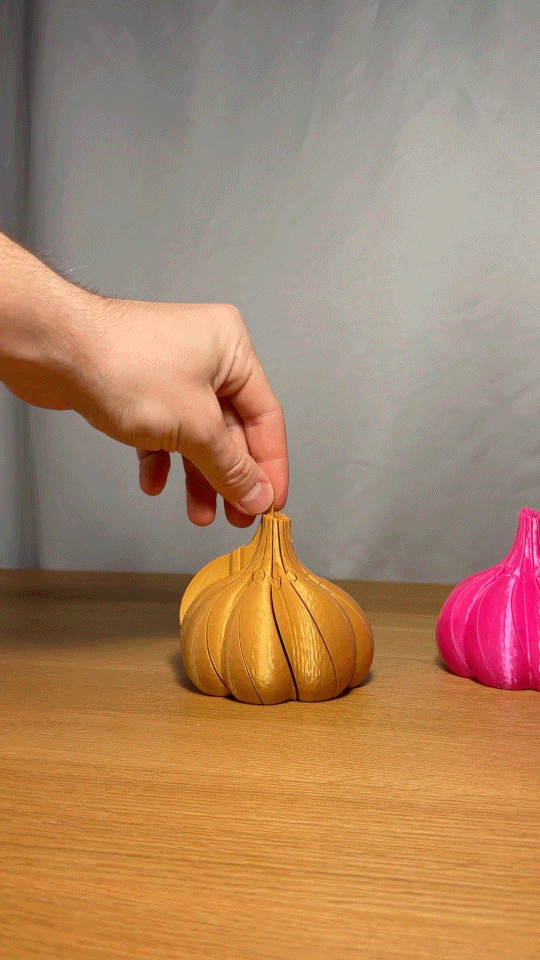 Một món đồ chơi fidget theo phong cách xoắn lấy cảm hứng từ hình dáng của một củ tỏi. Thiết kế gồm nhiều phân đoạn cho phép mô hình mở rộng và xoắn thành hình xoắn ốc linh hoạt, tạo ra sự biến đổi đầy thú vị giữa một vật trang trí nhỏ gọn và một món đồ chơi fidget tương tác.