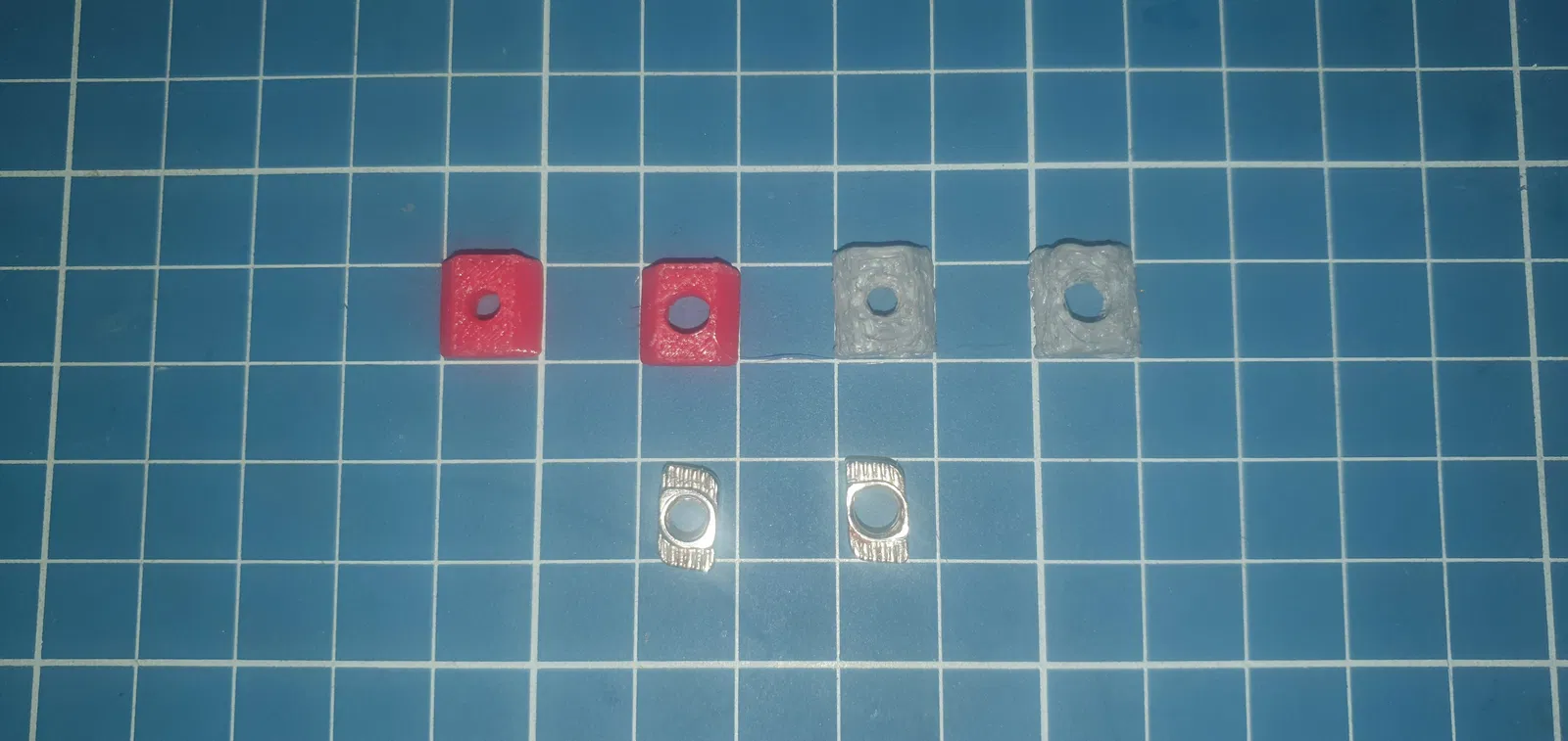 Vì con Easythreed K10 của tôi in các chi tiết yêu cầu độ chính xác cao khá tệ, nên tôi đã đặt in thử mẫu này bằng nhựa Red PETG tại một tiệm in gần nhà. Cả hai đều lắp vừa khít vào thanh nhôm và chắc chắn không thua gì mấy loại T-nut bằng thép mà bạn vẫn hay mua trên mạng.