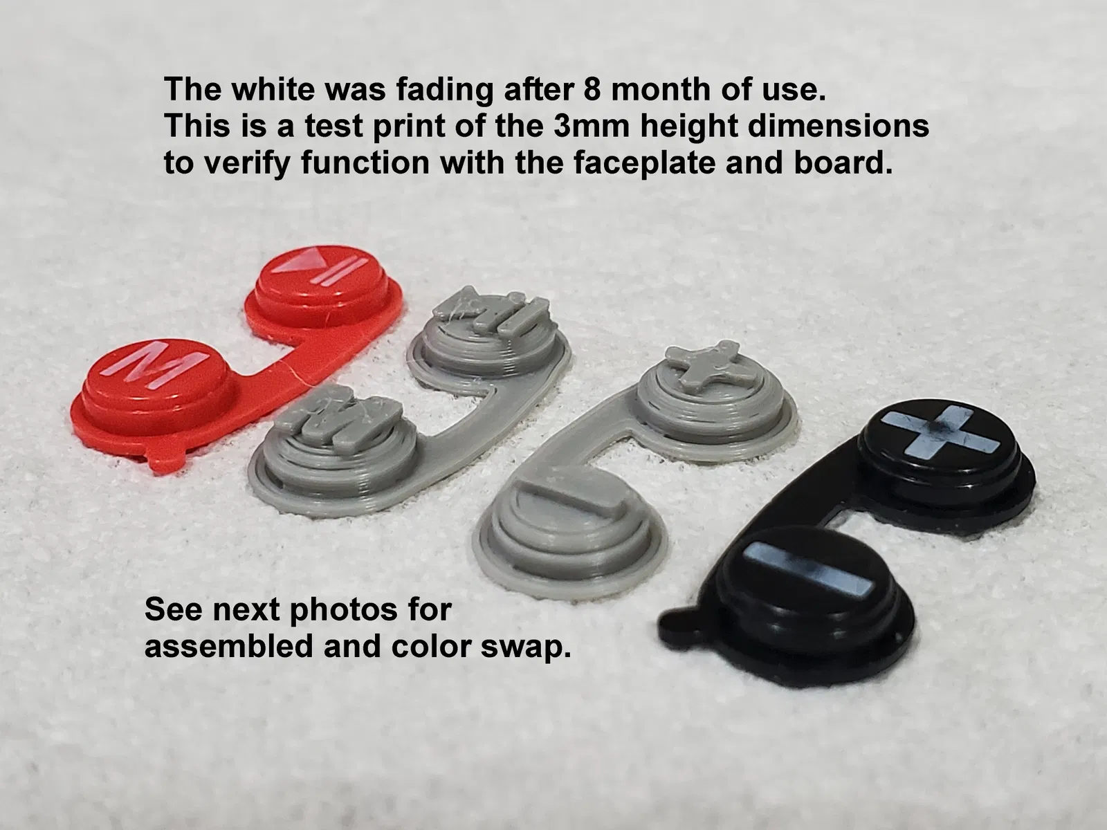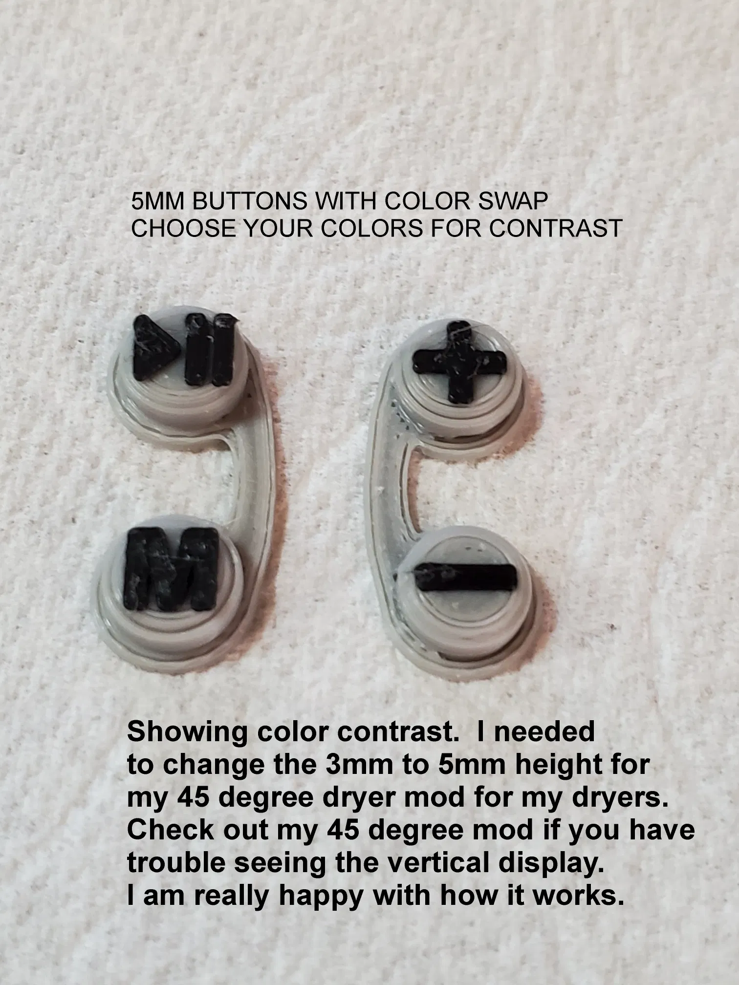 Bộ nút bấm 3mm này mình thiết kế cho mô hình Polydryer Snapdryer đặt nghiêng 45 độ. Do muốn phần mặt ngoài cao hơn một chút nên mình có làm thêm một bộ 5mm nữa. Vì mấy nút zin của máy (loại cao su đỏ và đen) bị bạc màu do dùng lâu, nên mình đã thiết kế bộ này và in bằng cách đổi màu nhựa (color swap) ngay trong lúc in.