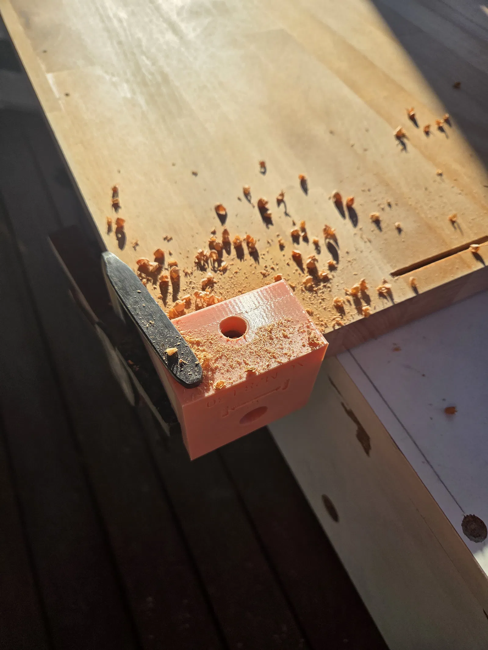 - Lưu ý sử dụng: Luôn kiểm tra lại độ khít của khuôn với tấm gỗ trước khi khoan thật. Bạn có thể sử dụng thêm kẹp để giữ cố định khuôn trong quá trình thao tác.
