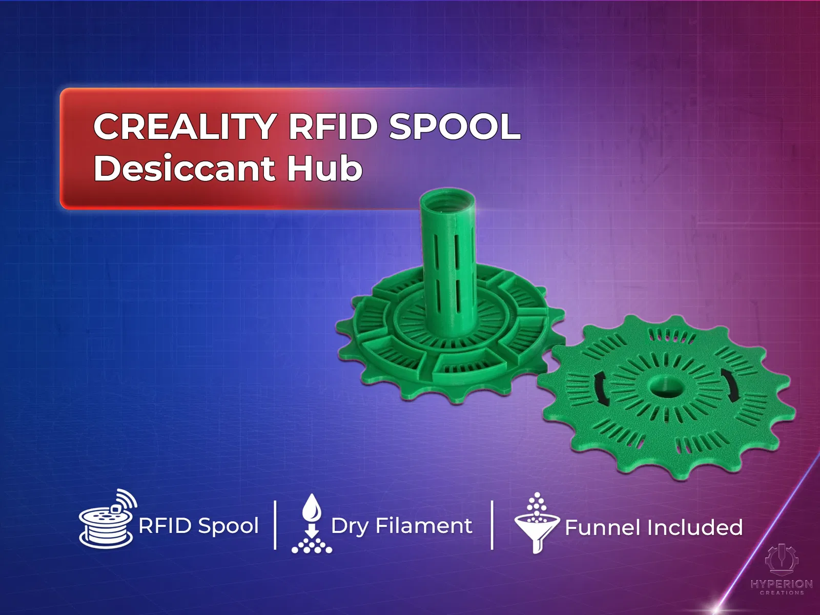 • RFID Spool Desiccant Hub – Đế (Base) • RFID Spool Desiccant Hub – Nắp (Lid) • Dụng cụ phễu hút ẩm tùy chọn (HCBSS Smart Support)