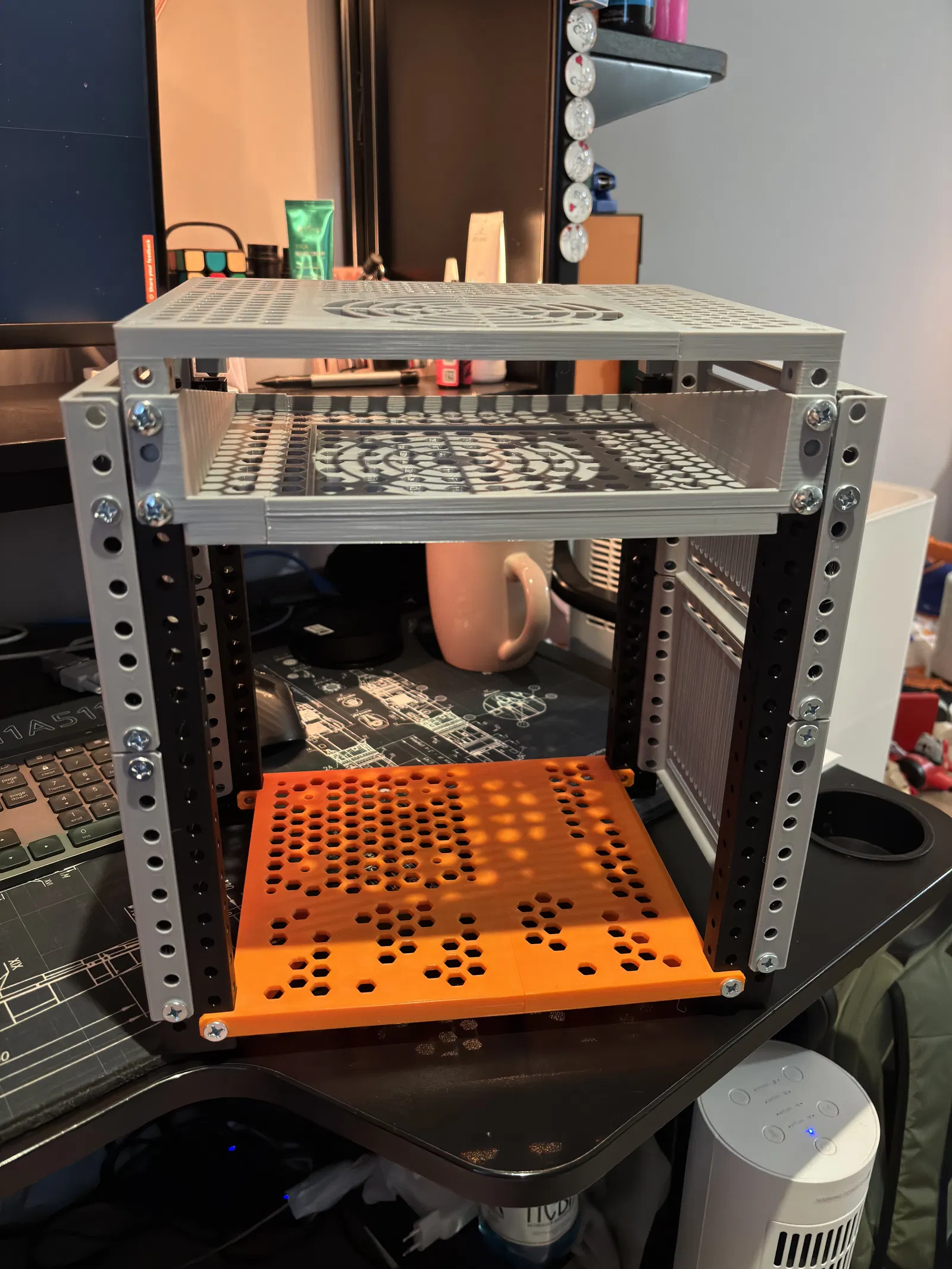 Cấu trúc của kệ được thiết kế dạng lưới tổ ong, vừa đảm bảo độ cứng cáp cần thiết để nâng đỡ các thiết bị, vừa tạo độ thông thoáng tối đa giúp tản nhiệt tốt hơn. Các khe hở được tính toán kỹ lưỡng để không khí dễ dàng lưu thông qua các thiết bị máy chủ, vốn thường rất nóng khi hoạt động liên tục. Anh em có thể tự do lắp ghép nhiều tầng tùy theo nhu cầu sử dụng của hệ thống mạng cá nhân, tạo nên một không gian làm việc gọn gàng, chuyên nghiệp và cực kỳ đậm chất kỹ thuật.