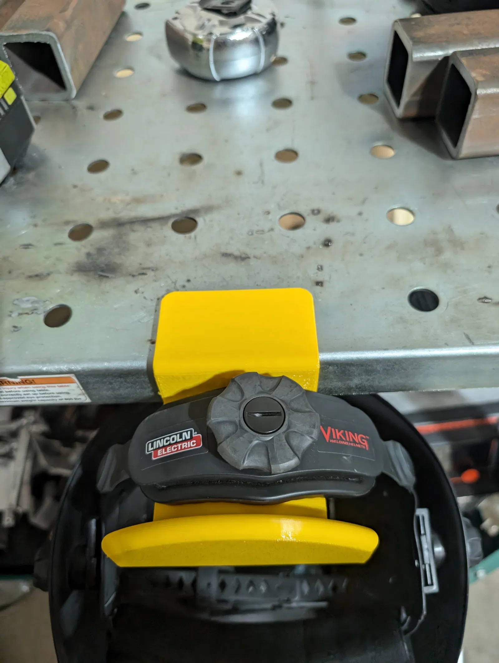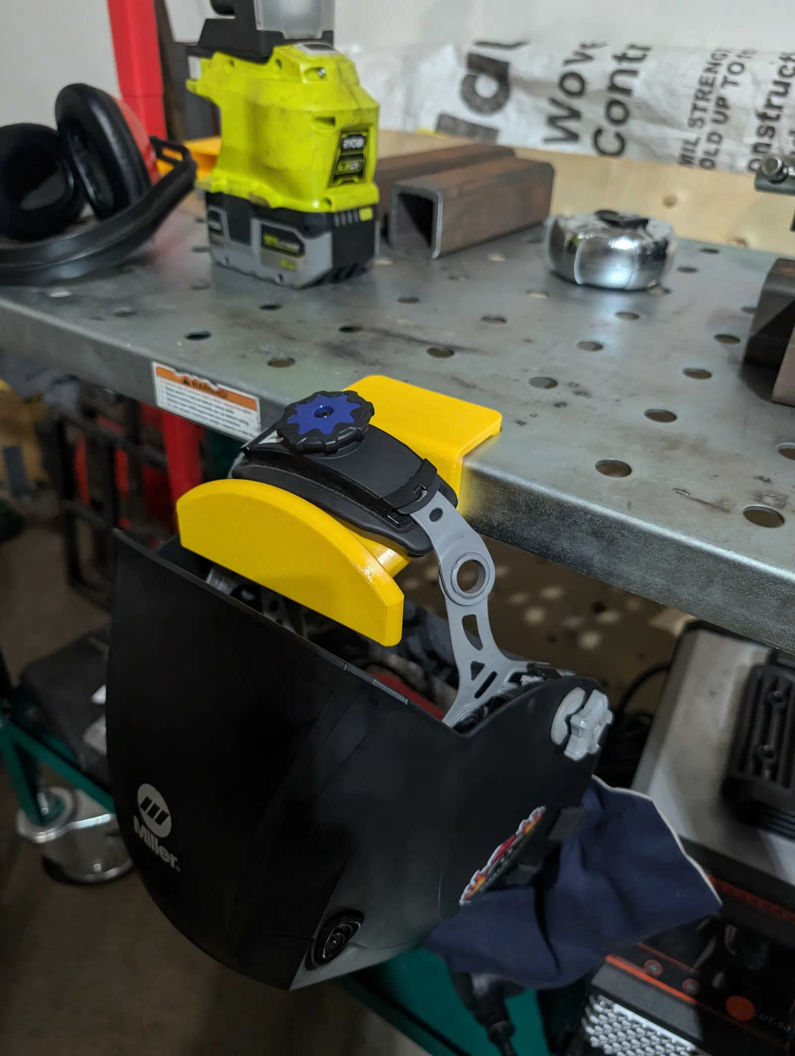 Tôi thấy phiền vì cái mặt nạ hàn cứ bị rơi khỏi bàn hoặc xe đẩy hàn nên đã thiết kế cái móc này. Móc sử dụng các lỗ fixture 5/8" có sẵn trên bàn để gắn vào và giữ được nhiều loại mặt nạ khác nhau. Tôi đã xác nhận là dùng vừa với dây đeo của mặt nạ Miller, Lincoln Electric và Yeswelder; thiết kế này cũng nên vừa với hầu hết, nếu không muốn nói là tất cả các loại mặt nạ hàn hiện nay.
