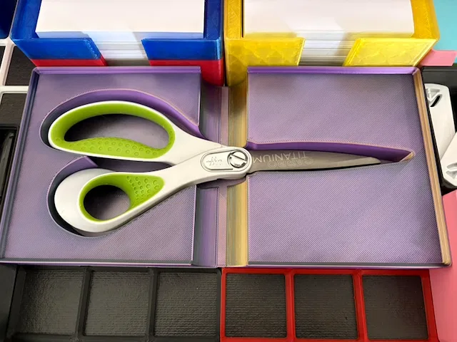 Hộp đựng Gridfinity giúp bạn sắp xếp gọn gàng một chiếc kéo Fiskars. Thiết kế tuy tốn diện tích nhưng rất tiện lợi. Bạn có thể tùy chỉnh lại dễ dàng với file OpenSCAD đi kèm.