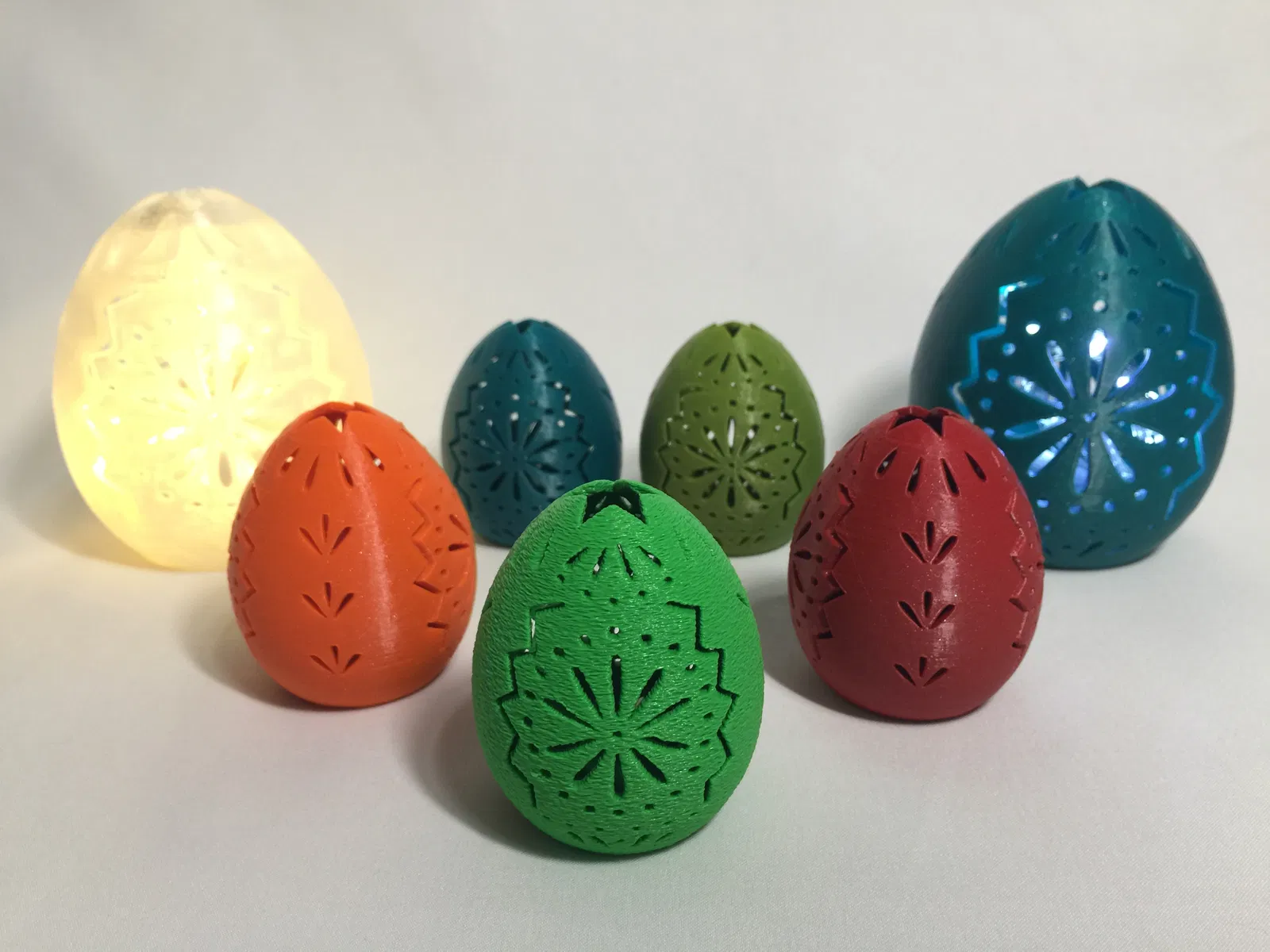 Bộ sưu tập trứng trang trí xinh xắn cho máy in 3D đơn màu. Phiên bản 1 là mẫu trứng tiêu chuẩn, còn phiên bản 2 được thiết kế thông minh để bạn có thể đặt thêm đèn trà điện tử bên trong, tạo không khí ấm cúng cho không gian của bạn.