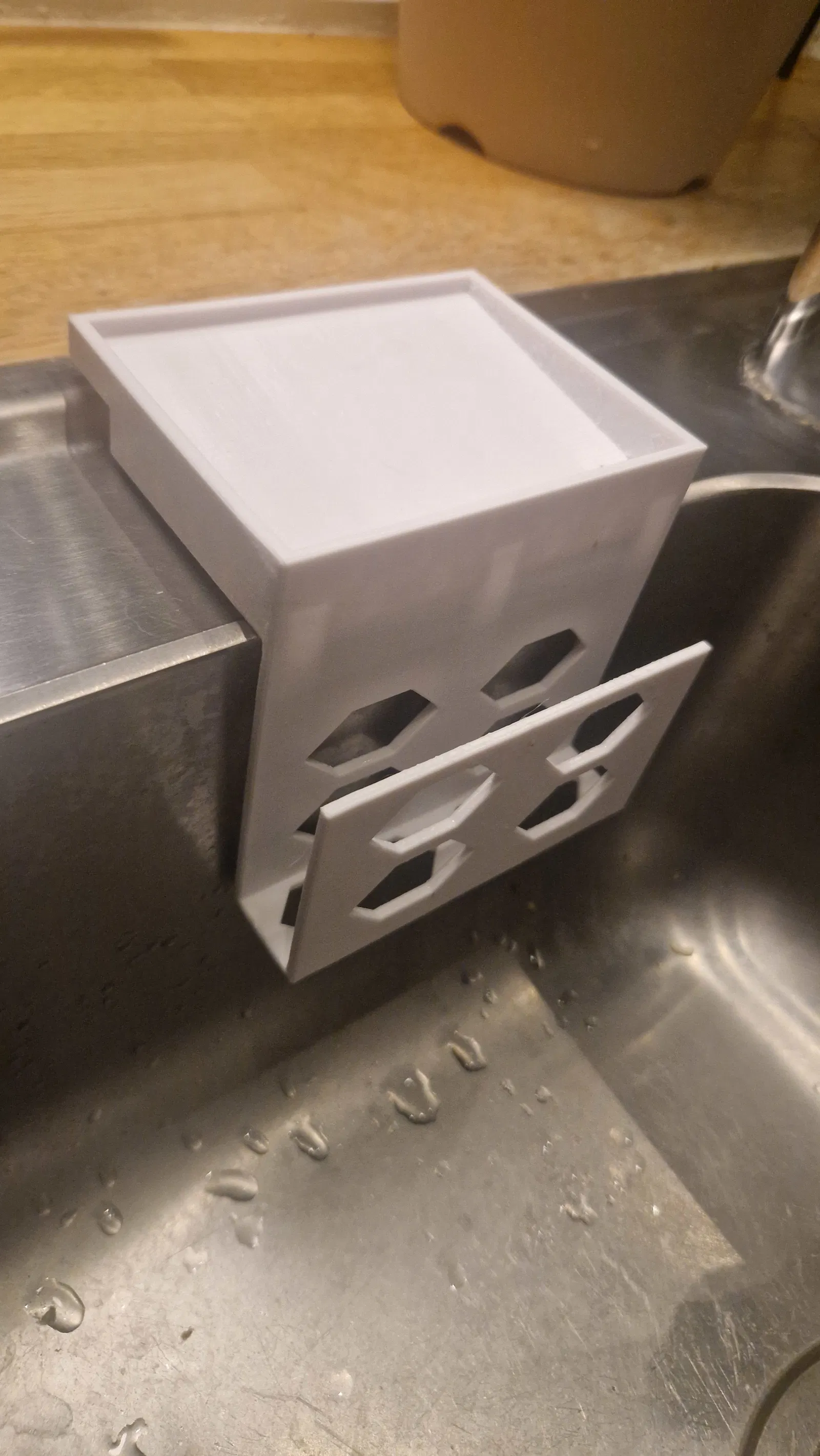 Mẫu thiết kế này dùng để đặt miếng bọt biển và khăn lau bát đĩa ngay tại bồn rửa chén. Phần khoang để bọt biển có thiết kế thoát nước qua 3 đường ống nhỏ nằm phía sau chỗ vắt khăn. Bạn có thể dễ dàng gắn giá vào bồn rửa bằng cách sử dụng núm hút chân không chống trượt loại dùng cho điện thoại. Tôi đã in mẫu này bằng nhựa PETG, sử dụng đầu in 0.4mm với độ phân giải lớp in 0.2mm. Khi in, hãy đặt nằm nghiêng và chỉ cần dùng support cho một trong các vách bên của ngăn để bọt biển.