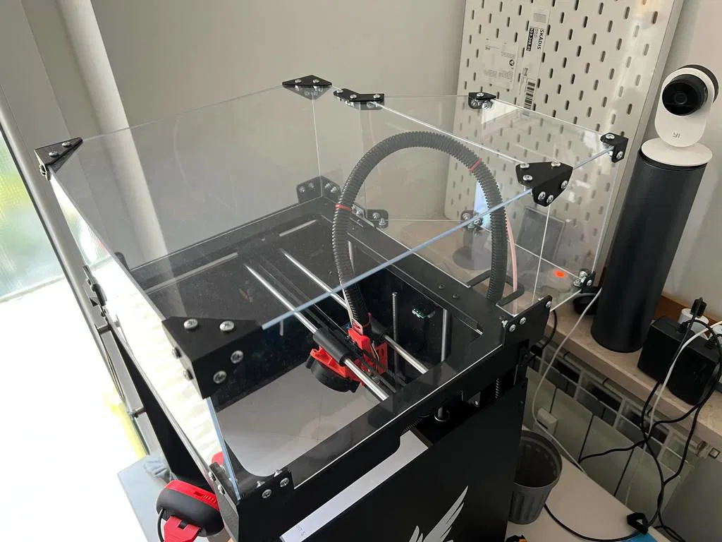 Mình tạo ra phần nắp che này dựa trên nhu cầu sử dụng thực tế của bản thân. Toàn bộ phần che phía trên được thiết kế để giữ nguyên cấu trúc dây bowden và ống ruột gà zin, đảm bảo không cản trở chuyển động của máy. Khi cần thiết, bạn có thể dán kín các mép xung quanh tấm plexiglass bằng băng keo điện hoặc các loại vật liệu tương tự. Về phần plexiglass, mình dùng loại dày 3mm, mua một tấm kích thước 50x100cm từ Leroy Merlin. Bạn cần chuẩn bị thêm 61 bộ ốc M4x12 kèm đai ốc và vòng đệm. Mình đã đính kèm file DXF để cắt plexiglass cùng hai hình ảnh minh họa về kích thước và cách cắt. Cập nhật ngày 18/01/2024: Mình có bổ sung thêm một file DXF mới không bao gồm phần cắt khoét 40x40x40 cho gioăng (dành cho các bạn đặt cắt tấm tại xưởng để tránh lỗi, vì phần cắt đó thường tạo góc nhọn dễ bị giòn gãy). Tất nhiên với bản này, bạn sẽ cần tự tay cắt chỉnh lại phần đó. Đừng quên ghé thăm các dự án khác của mình trên MakerWorld nhé, đảm bảo bạn sẽ thấy thú vị! https://makerworld.com/en/@Tremmannaik/upload