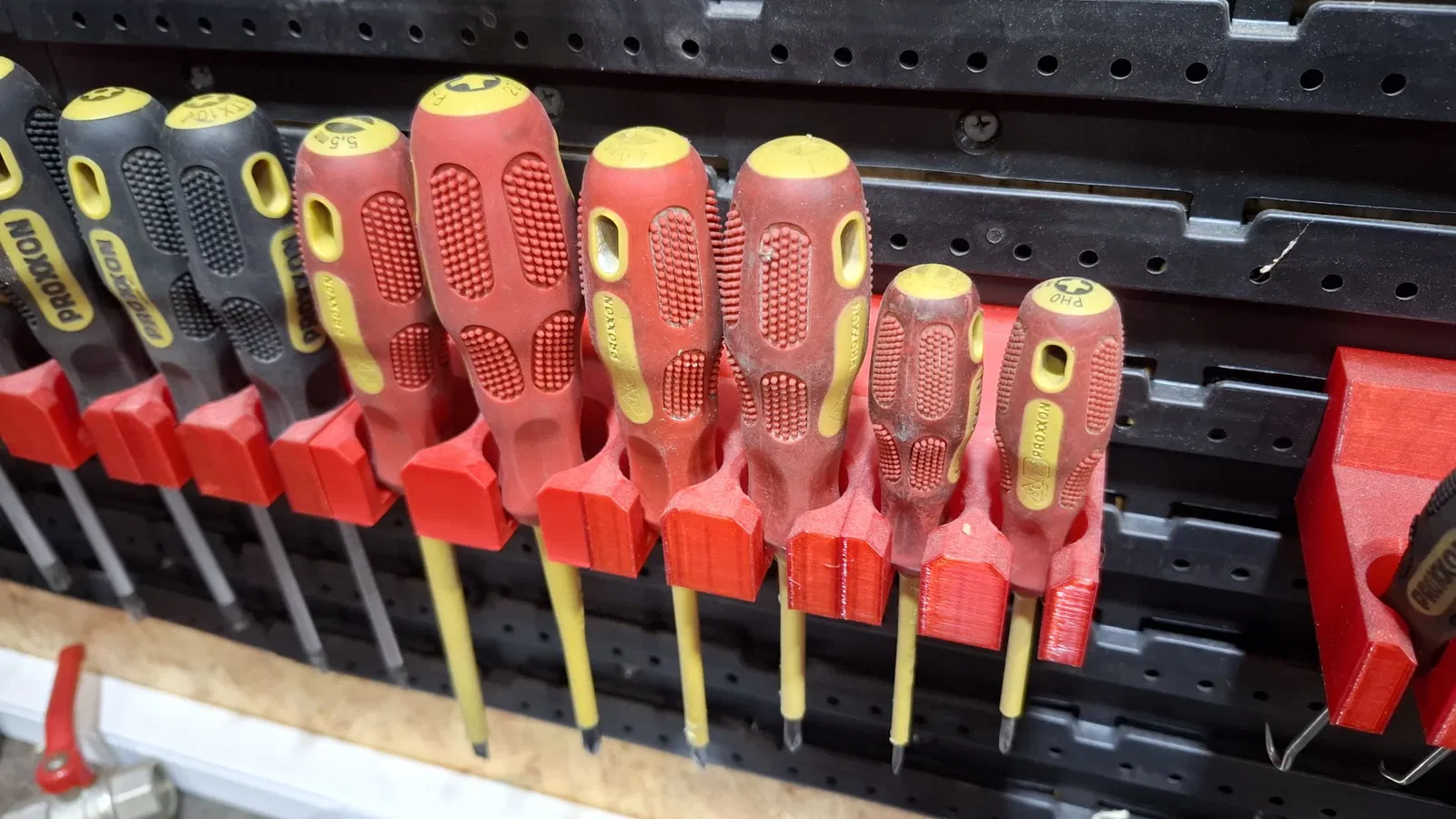 Ở đây mình có 3 loại giá treo khác nhau để đựng các kích cỡ tua vít tùy ý, các bác chỉ cần lưu ý đường kính của tay cầm (mình đã ghi chú cụ thể trong file). Mình đang dùng bộ này để treo toàn bộ dàn tua vít Proxxon trên bảng dụng cụ của mình.