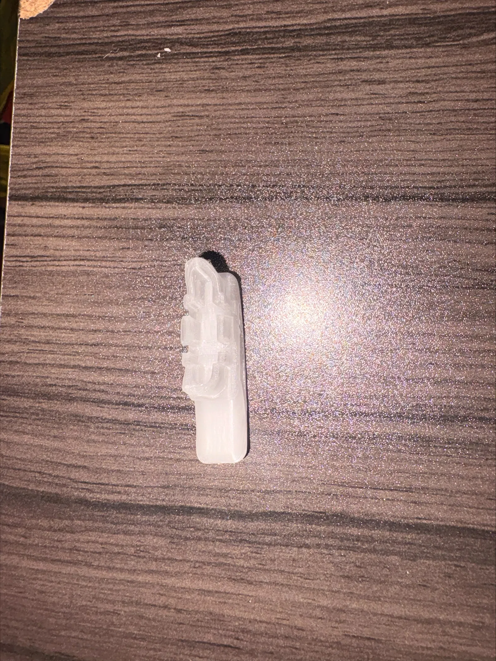 Bạn mình nhờ in cái chốt chặn ray này mà mình tìm trên mạng không thấy, nên mình đã tự vẽ 3D luôn. Hiện tại mình chưa rõ nó có khớp 100% hay không. Mình đã in bằng PETG trong suốt (vì đây là loại nhựa duy nhất mình còn dư), với chiều cao lớp in 0.8mm.
