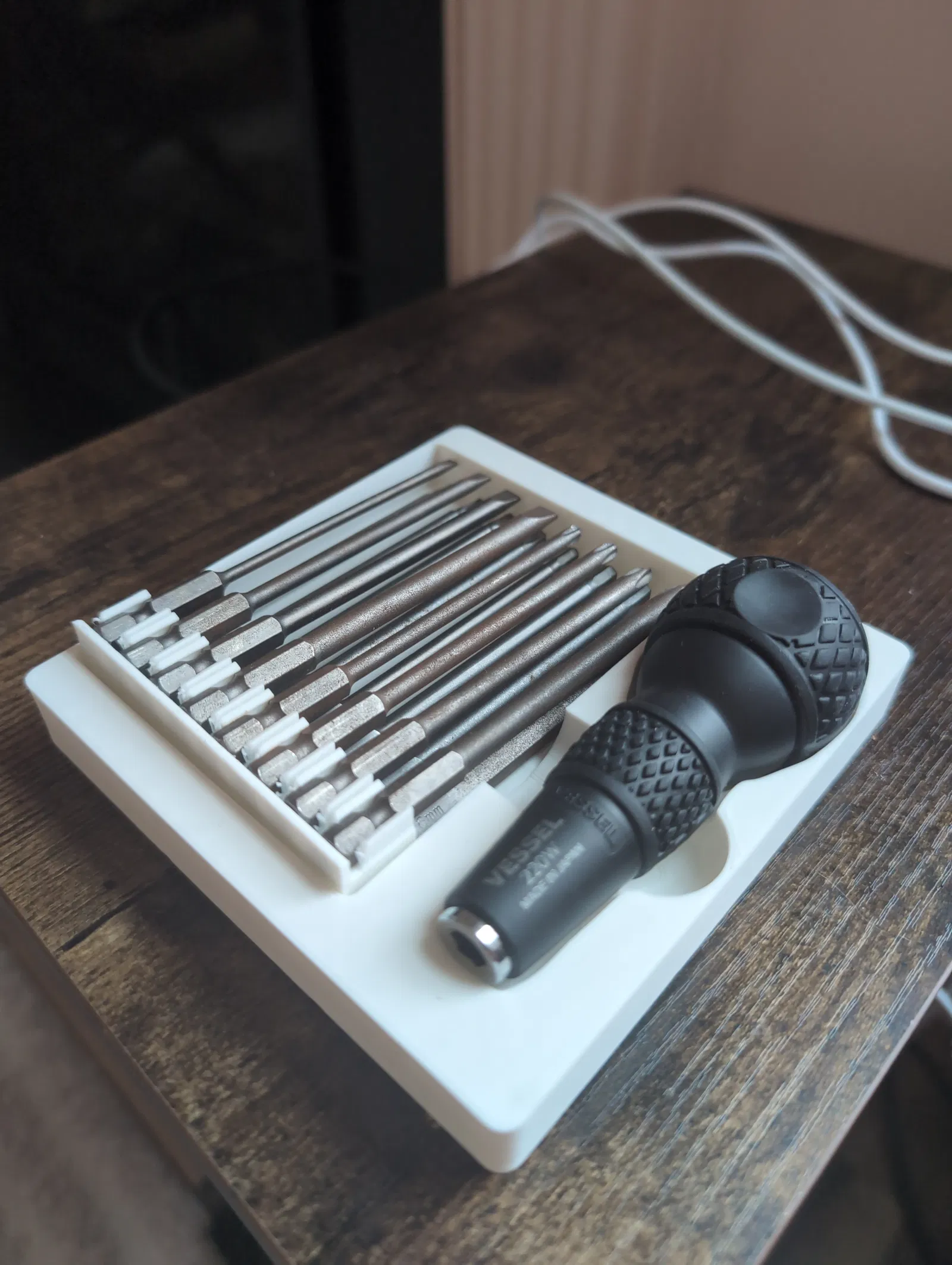 Khay đựng theo chuẩn Gridfinity được thiết kế riêng để cất giữ tua vít Vessel 220w ball grip và bộ mũi vít 4 inch gọn gàng. Giải pháp tiện lợi giúp góc làm việc của anh em ngăn nắp hơn.