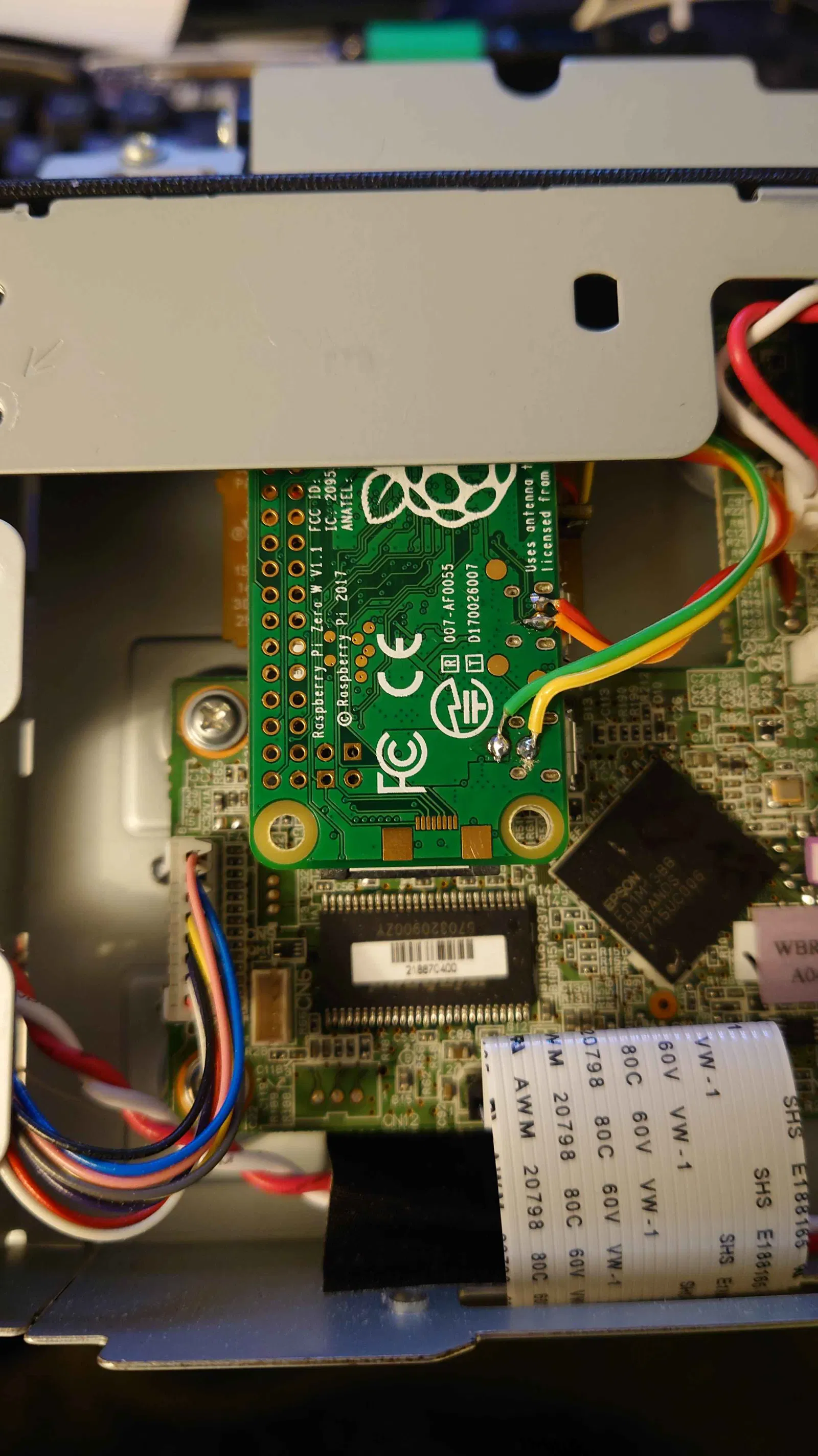 Khung gắn (sled) dùng để lắp và cấp nguồn cho Raspberry Pi Zero ngay bên trong khe phụ kiện của máy in nhiệt Epson TM-T88V, giúp kết nối máy in qua mạng không dây một cách tiện lợi với CUPS.
