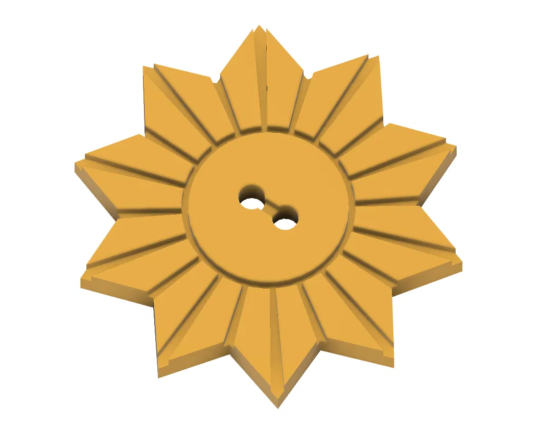 Đây là một chiếc cúc áo hình mặt trời nhỏ nhắn có sẵn lỗ để các bạn khâu lên đồ dùng. #### Hướng dẫn in Mình đã in mẫu này ở tư thế mặt hướng lên trên, chỉ dùng một màu, không cần support, với chất liệu PLA. Bạn nên chọn chiều cao lớp in (layer height) nhỏ nhất mà máy in của bạn có thể đáp ứng để đảm bảo độ chi tiết sắc nét. Theo thiết kế ban đầu, chiếc cúc có đường kính 30mm, nhưng bạn hoàn toàn có thể phóng to hoặc thu nhỏ tùy ý trong phần mềm slicer. #### Về thiết kế Vì mình không thể tạo được tệp SVG ưng ý từ hình ảnh gốc, nên mình đã dựng lại mô hình dựa trên phác thảo trong Fusion 360.