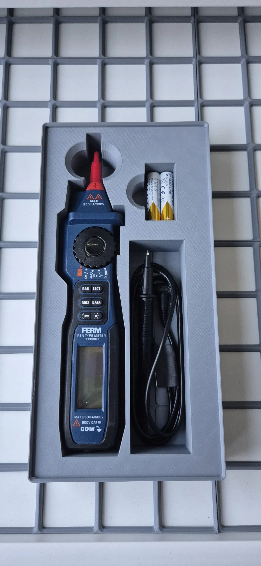 Điểm cộng lớn của mẫu thiết kế này chính là sự tích hợp thông minh. Ngoài vị trí dành riêng cho đồng hồ vạn năng FERM, khay còn có ngăn chứa riêng biệt cho dây đo và các khe cắm pin tiện lợi (có thể chứa 4 viên pin AAA). Nhờ đó, tất cả những gì bạn cần cho một công việc kiểm tra điện đều nằm gọn gàng trong cùng một module, giúp tiết kiệm thời gian tìm kiếm đáng kể.